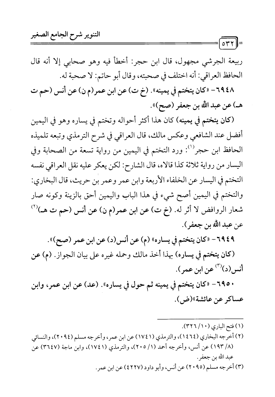 6948 - "كان يتختم في يمينه". (خ ت) عن ابن عمر (م ن) عن أنس (حم ت هـ) عن عبد الله بن جعفر (صح) ".