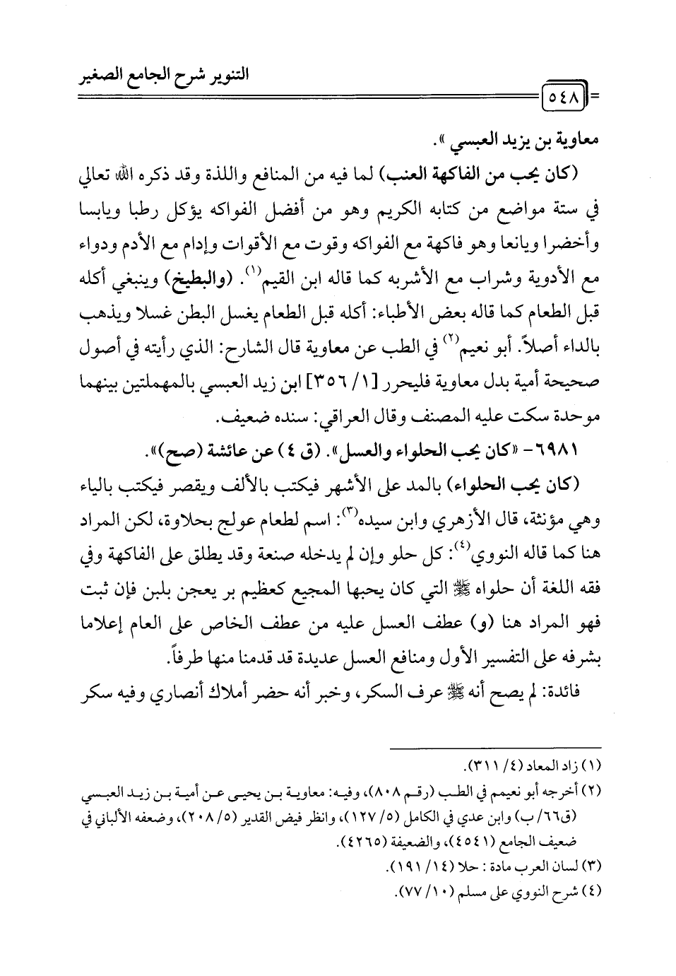 (¬2) أخرجه أبو نعيم في الطب (رقم 808)، وفيه: معاوية بن يحيى عن أمية بن زيد العبسي (ق 66/ ب) وابن عدي في الكامل (5/ 127)، وانظر فيض القدير (5/ 208)، وضعفه الألباني في ضعيف الجامع (4541)، والضعيفة (4265).