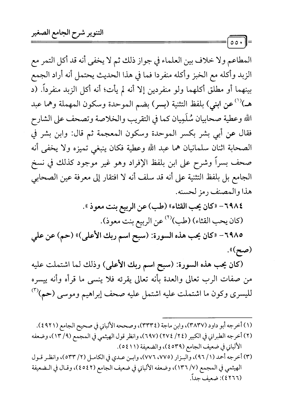 المطاعم ولا خلاف بين العلماء في جواز ذلك ثم لا يخفى أنه قد أكل التمر مع الزبد وأكله مع الخبز وأكله منفردا فما في هذا الحديث يحتمل أنه أراد الجمع بينهما أو مطلق أكلهما ولو منفردين إلا أنه لم يأت؛ أنه أكل الزبد منفرداً. (د هـ) (¬1) عن ابني) بلفظ التثنية (بسر) بضم الموحدة وسكون المهملة وهما عبد الله وعطية صحابيان سُلَمِيان كما في التقريب والخلاصة وتصحف على الشارح فقال عن أبي بشر بكسر الموحدة وسكون المعجمة ثم قال: وابن بشر في الصحابة اثنان سلمانيان هما عبد الله وعطية فكان ينبغي تميزه ولا يخفى أنه صحف بسراً وشرح على ابن بلفظ الإفراد وهو غير موجود كذلك في نسخ الجامع بل بلفظ التثنية على أنه قد سلف أنه لا افتقار إلى معرفة عين الصحابي هذا والمصنف رمز لحسنه.
