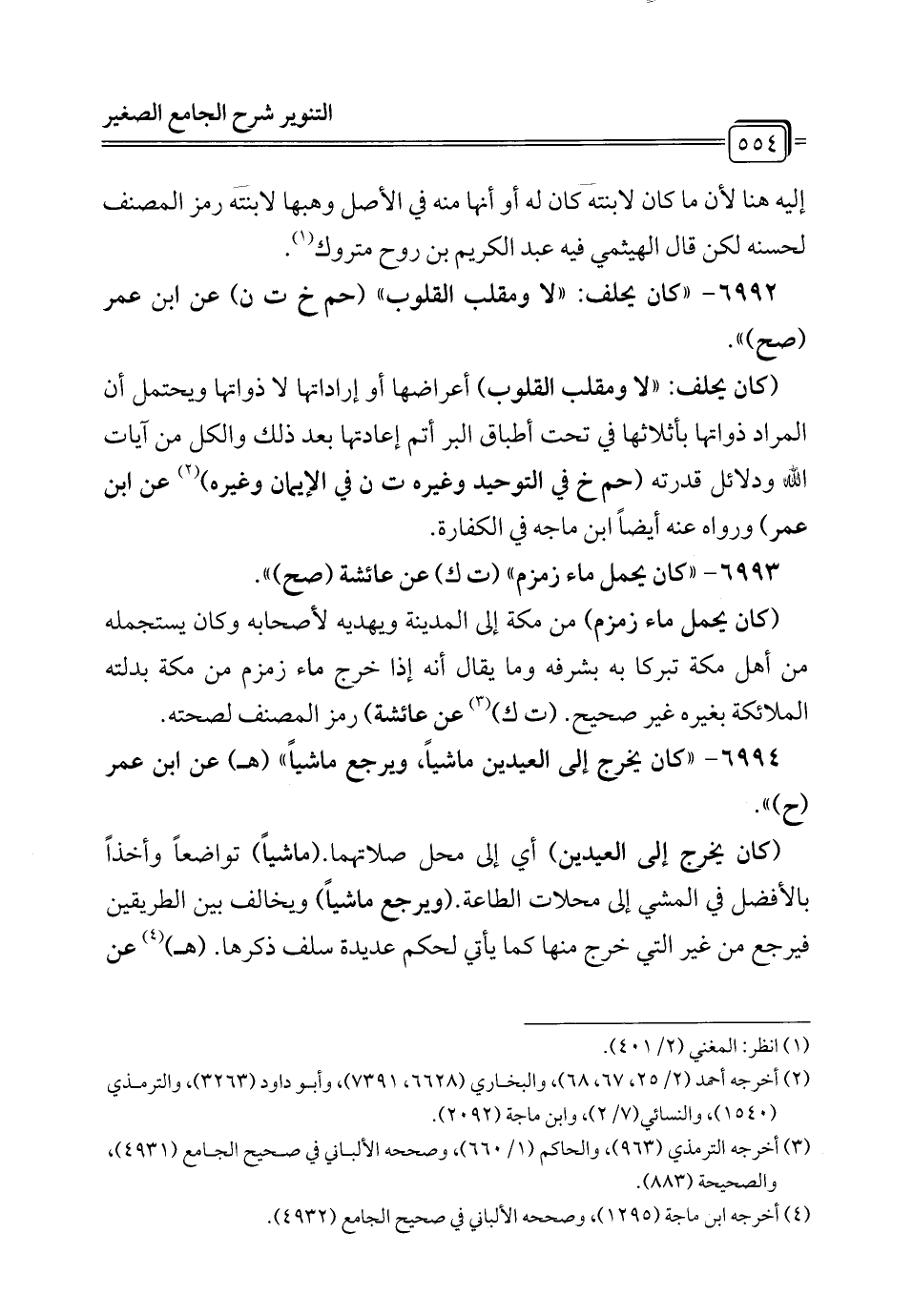 6994 - "كان يخرج إلى العيدين ماشياً، ويرجع ماشياً" (هـ) عن ابن عمر (ح) ".