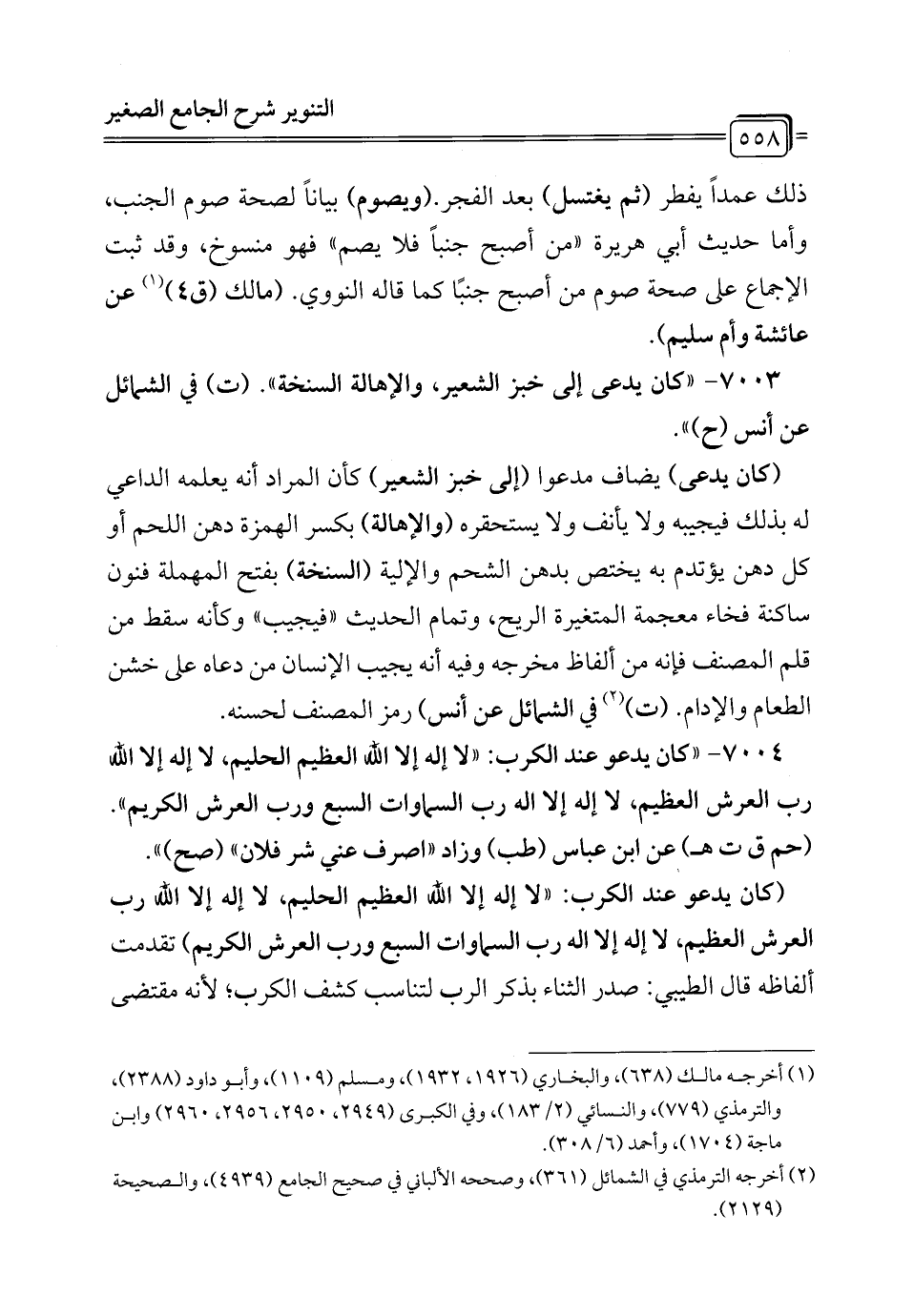 7004 - "كان يدعو عند الكرب: "لا إله إلا الله العظيم الحليم، لا إله إلا الله رب العرش العظيم، لا إله إلا اله رب السماوات السبع ورب العرش الكريم". (حم ق ت هـ عن ابن عباس (طب) وزاد "اصرف عني شر فلان" (صح) ".