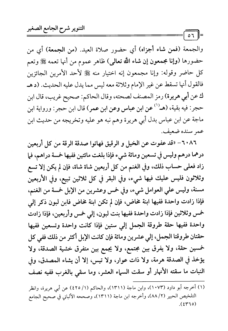 6086 - "قد عفوت عن الخيل والرقيق فهاتوا صدقة الرقة من كل أربعين درهما درهم وليس في تسعين ومائة شيء فإذا بلغت مائتين ففيها خمسة دراهم، فما زاد فعلى حساب ذلك، وفي الغنم من كل أربعين شاة شاة، فإن لم يكن إلا تسع وثلاثون فليس عليك فيها شيء، وفي البقر في كل ثلاثين تبيع، وفي الأربعين مسنقع وليس علي العوامل شيء، وفي خمس وعشرين من الإبل خمسة من الغنم، فإذا زادت واحدة ففيها ابنة مخاض، فإن لم تكن ابنة مخاض فابن لبون ذكر إلى خمس وثلاثين فإذا زادت واحدة ففيها بنت لبون، إلى خمس وأربعين، فإذا زادت واحدة ففيها حقة طروقة الجمل إلى ستين فإذا كانت واحدة وتسعين ففيها حقتان طروقتا الجمل، إلى عشرين ومائة فإن كانت الإبل أكثر من ذلك ففي كل خمسين حقة، ولا يفرق بين مجتمع، ولا يجمع بين متفرق خشية الصدق؛ ولا يؤخذ في الصدقة هرمة، ولا ذات عوار، ولا تيس، إلا أن يشاء المصدق، وفي النبات ما سقته الأنهار أو سقت السماء العشر، وما سقي بالغرب ففيه نصف