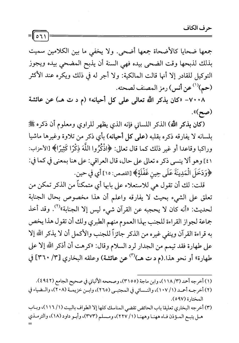 7008 - "كان يذكر الله تعالى على كل أحيانه" (م د ت هـ) عن عائشة (صح) ".