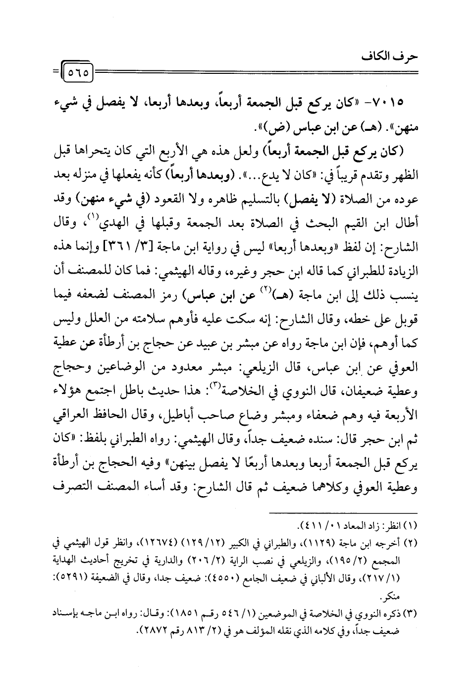7015 - "كان يركع قبل الجمعة أربعاً، وبعدها أربعا، لا يفصل في شيء منهن". (هـ) عن ابن عباس (ض) ".