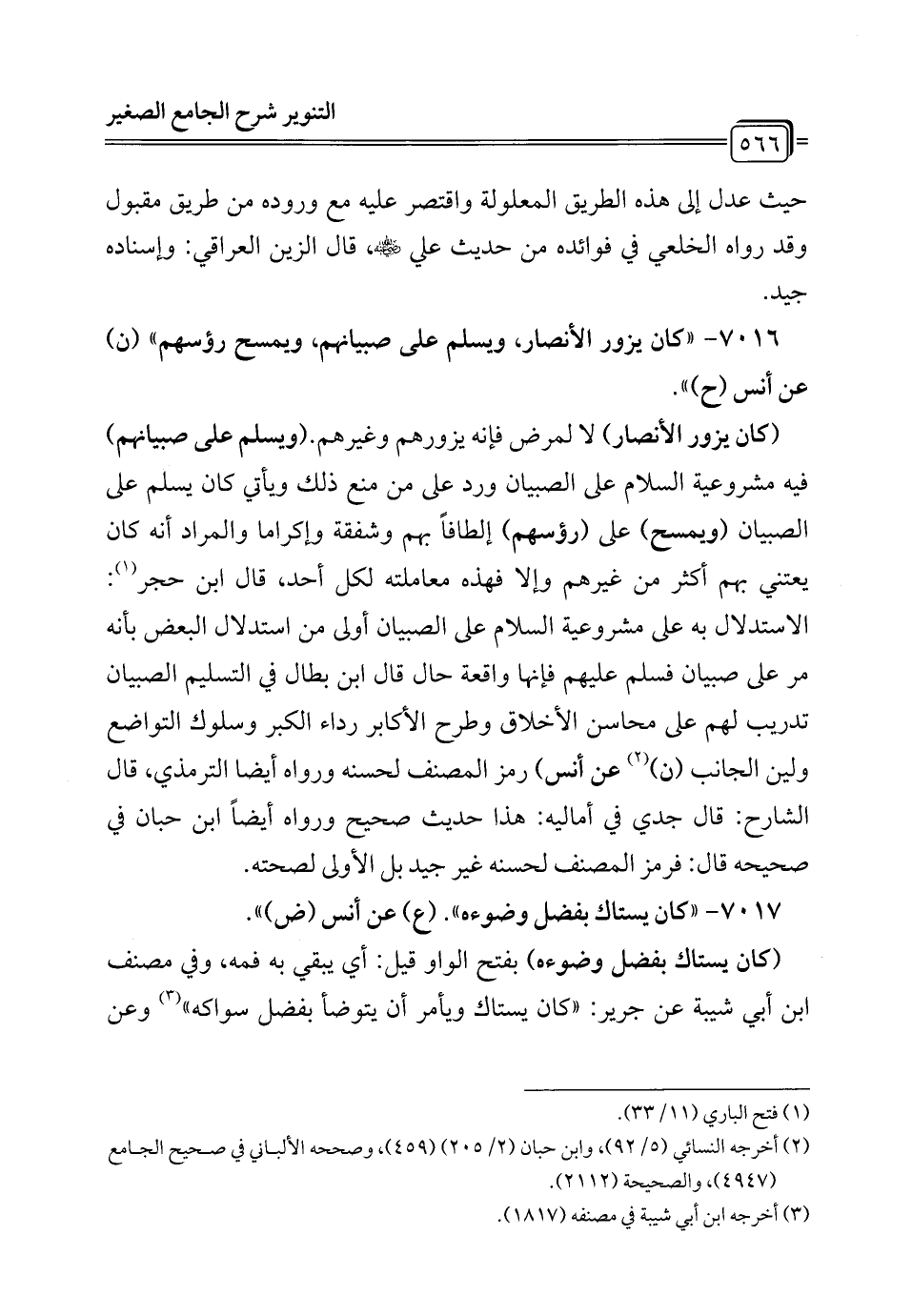 (كان يزور الأنصار) لا لمرض فإنه يزورهم وغيرهم. (ويسلم على صبيانهم) فيه مشروعية السلام على الصبيان ورد على من منع ذلك ويأتي كان يسلم على الصبيان (ويمسح) على (رؤسهم) إلطافاً بهم وشفقة وإكراما والمراد أنه كان يعتني بهم أكثر من غيرهم وإلا فهذه معاملته لكل أحد، قال ابن حجر (¬1): الاستدلال به على مشروعية السلام على الصبيان أولى من استدلال البعض بأنه مر على صبيان فسلم عليهم فإنها واقعة حال قال ابن بطال في التسليم الصبيان تدريب لهم على محاسن الأخلاق وطرح الأكابر رداء الكبر وسلوك التواضع ولين الجانب (ن) (¬2) عن أنس) رمز المصنف لحسنه ورواه أيضا الترمذي، قال الشارح: قال جدي في أماليه: هذا حديث صحيح ورواه أيضاً ابن حبان في صحيحه قال: فرمز المصنف لحسنه غير جيد بل الأولى لصحته.