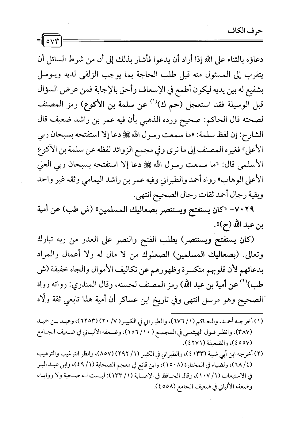 7029 - "كان يستفتح ويستنصر بصعاليك المسلمين" (ش طب) عن أمية بن عبد الله (ح) ".