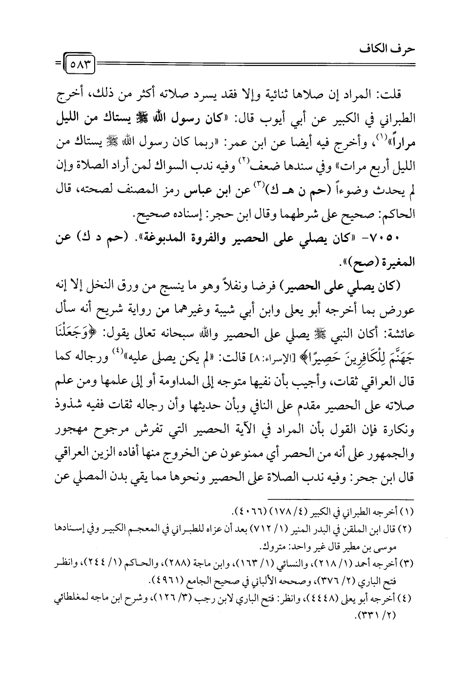 قلت: المراد إن صلاها ثنائية وإلا فقد يسرد صلاته أكثر من ذلك، أخرج الطبراني في الكبير عن أبي أيوب قال: "كان رسول الله - صلى الله عليه وسلم - يستاك من الليل مراراً" (¬1)، وأخرج فيه أيضا عن ابن عمر: "ربما كان رسول الله - صلى الله عليه وسلم - ويستاك من الليل أربع مرات" وفي سندها ضعف (¬2) وفيه ندب السواك لمن أراد الصلاة وإن لم يحدث وضوءاً (حم ن هـ ك) (¬3) عن ابن عباس رمز المصنف لصحته، قال الحاكم: صحيح على شرطهما وقال ابن حجر: إسناده صحيح.