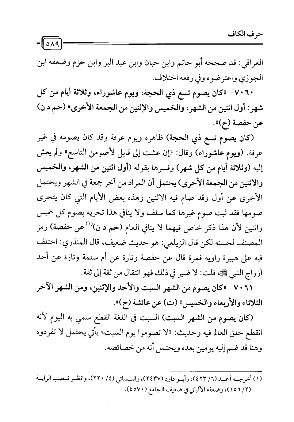 7060 - "كان يصوم تسع ذي الحجة، ويوم عاشوراء، وثلاثة أيام من كل شهر: أول اثنين من الشهر، والخميس والإثنين من الجمعة الأخرى" (حم د ن) عن حفصة (ح) ".