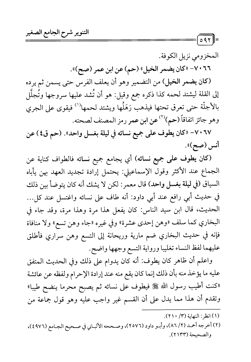 7067 - "كان يطوف على جميع نسائه في ليلة بغسل واحد". (حم ق 4) عن أنس (صح) ".