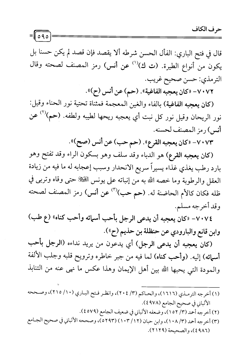 7074 - "كان يعجبه أن يدعى الرجل بأحب أسمائه وأحب كناه" (ع طب) وابن قانع والبارودي عن حنظلة بن حذيم (ح) ".