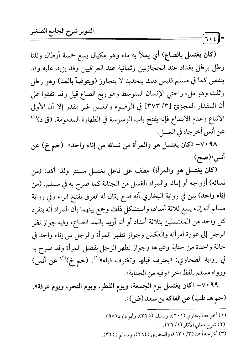 7098 - "كان يغتسل هو والمرأة من نسائه من إناء واحد". (حم خ) عن أنس" (صح).