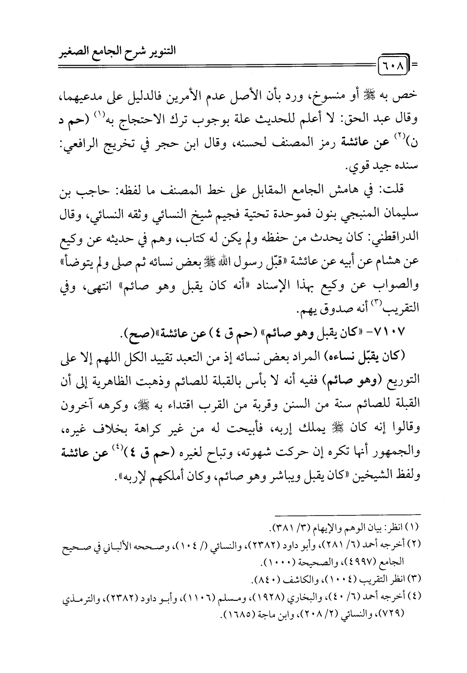 7107 - "كان يقبل وهو صائم" (حم ق 4) عن عائشة" (صح).