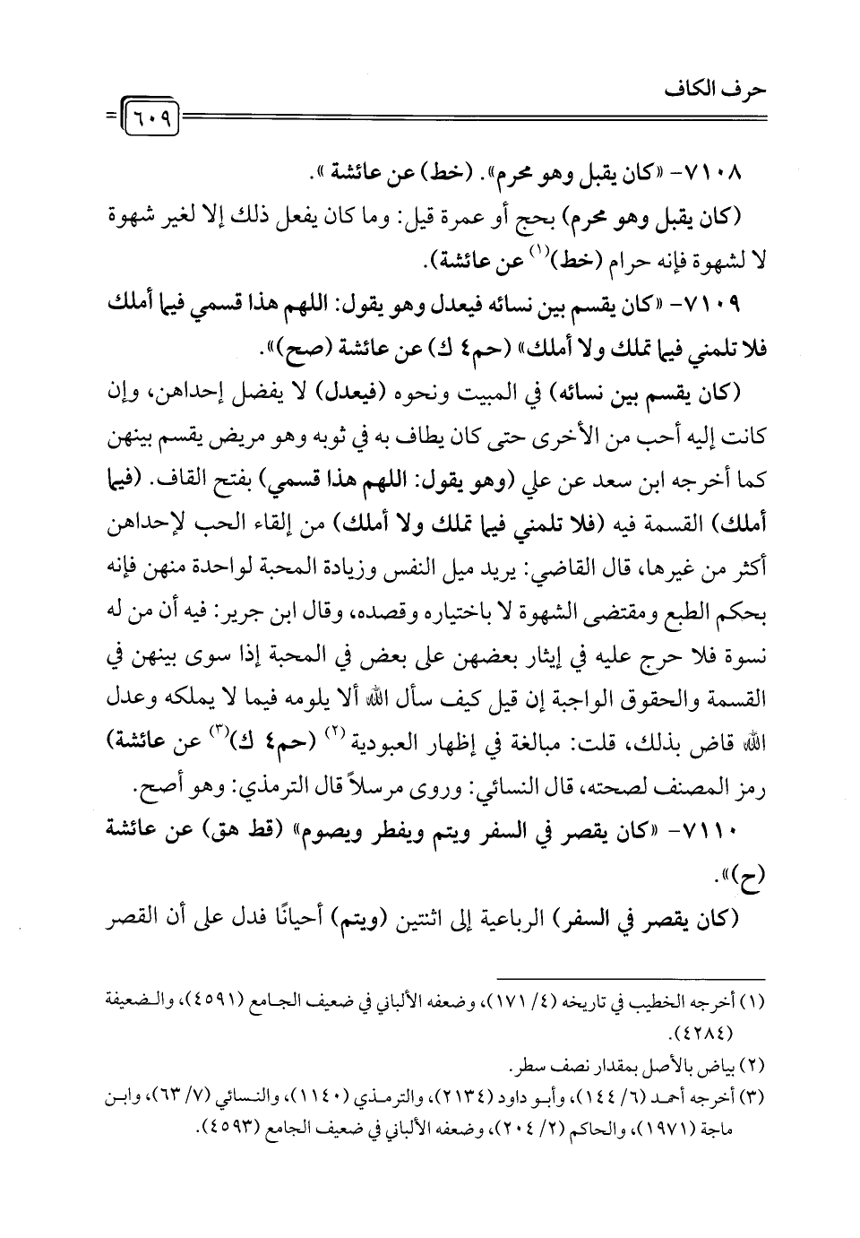 7109 - "كان يقسم بين نسائه فيعدل وهو يقول: اللهم هذا قسمي فيما أملك فلا تلمني فيما تملك ولا أملك" (حم 4 ك) عن عائشة (صح) ".