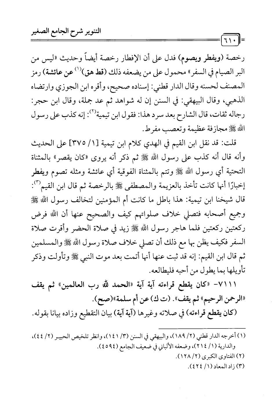 قلت: قد نقل ابن القيم في الهدي كلام ابن تيمية [1/ 375] على الحديث وأنه قال أنه كذب على رسول الله - صلى الله عليه وسلم - ثم ذكر أنه يروى "كان يقصر" بالمثناة التحتية أي رسول الله - صلى الله عليه وسلم - وتتم بالمثناة الفوقية أي عائشة ومثله تصوم ويفطر إخبارًا أنها كانت تأخذ بالعزيمة والمصطفى - صلى الله عليه وسلم - بالرخصة ثم قال ابن القيم (¬3): قال شيخنا ابن تيمية: هذا باطل ما كانت أم المؤمنين لتخالف رسول الله - صلى الله عليه وسلم - وجميع أصحابه فتصلي خلاف صلواتهم كيف والصحيح عنها أن الله فرض ركعتين ركعتين فلما هاجر رسول الله - صلى الله عليه وسلم - زيد في صلاة الحضر وأقرت صلاة السفر فكيف يظن بها مع ذلك أن تصلي خلاف صلاة رسول الله - صلى الله عليه وسلم - والمسلمين ثم قال ابن القيم: إنه قد ثبت عنها أنها أتمت بعد موت النبي - صلى الله عليه وسلم - وتأولت وذكر تأويلها بما يطول من أحبه فليطالعه.