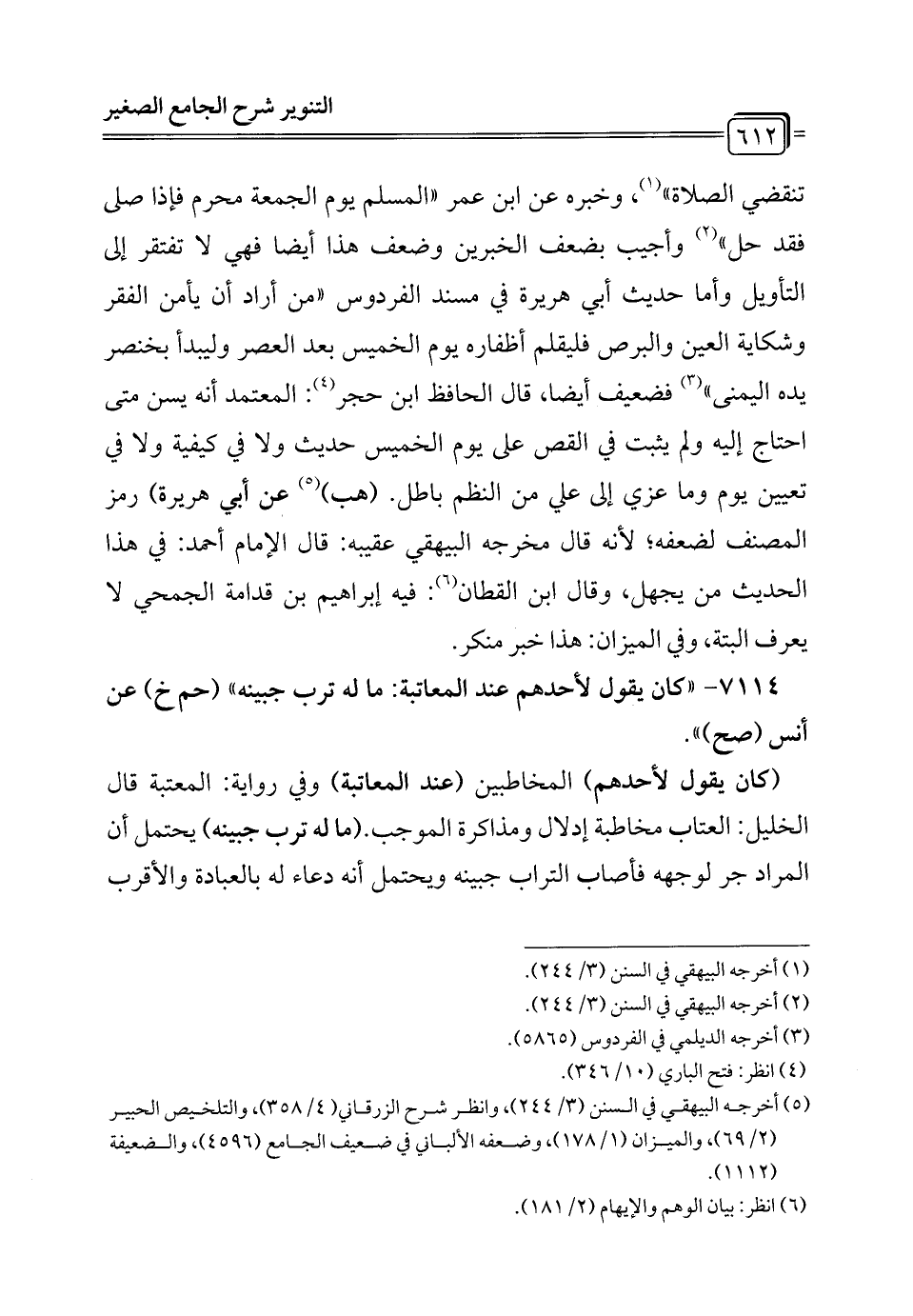 7114 - "كان يقول لأحدهم عند المعاتبة: ما له ترب جبينه" (حم خ) عن أنس (صح) ".