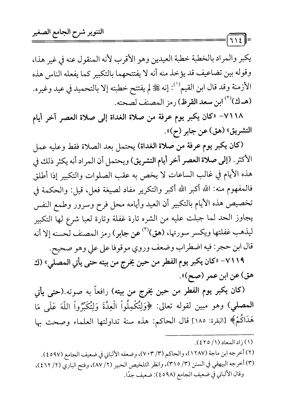 7119 - "كان يكبر يوم الفطر من حين يخرج من بيته حتى يأتي المصلي" (ك هق) عن ابن عمر (صح) ".