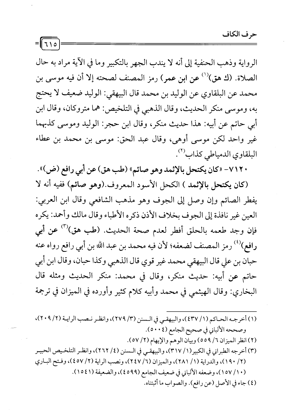 7120 - "كان يكتحل بالإثمد وهو صائم" (طب هق) عن أبي رافع (ض) ".