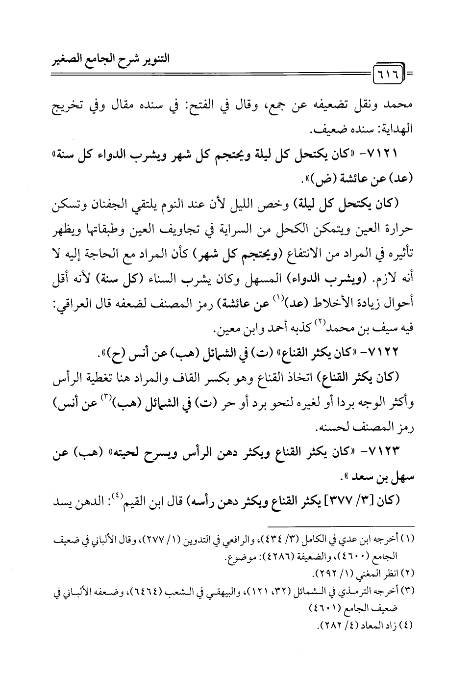 7121 - "كان يكتحل كل ليلة ويحتجم كل شهر ويشرب الدواء كل سنة" (عد) عن عائشة (ض) ".