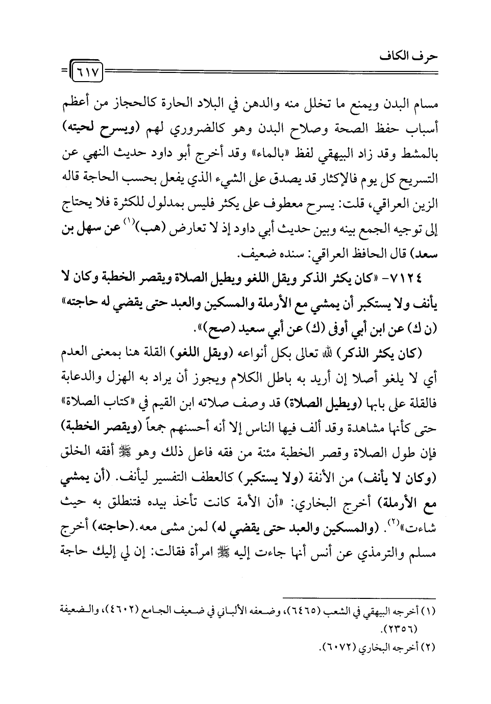 7124 - "كان يكثر الذكر ويقل اللغو ويطيل الصلاة ويقصر الخطبة وكان لا يأنف ولا يستكبر أن يمشي مع الأرملة والمسكين والعبد حتى يقضي له حاجته" (ن ك) عن ابن أبي أوفى (ك) عن أبي سعيد (صح) ".