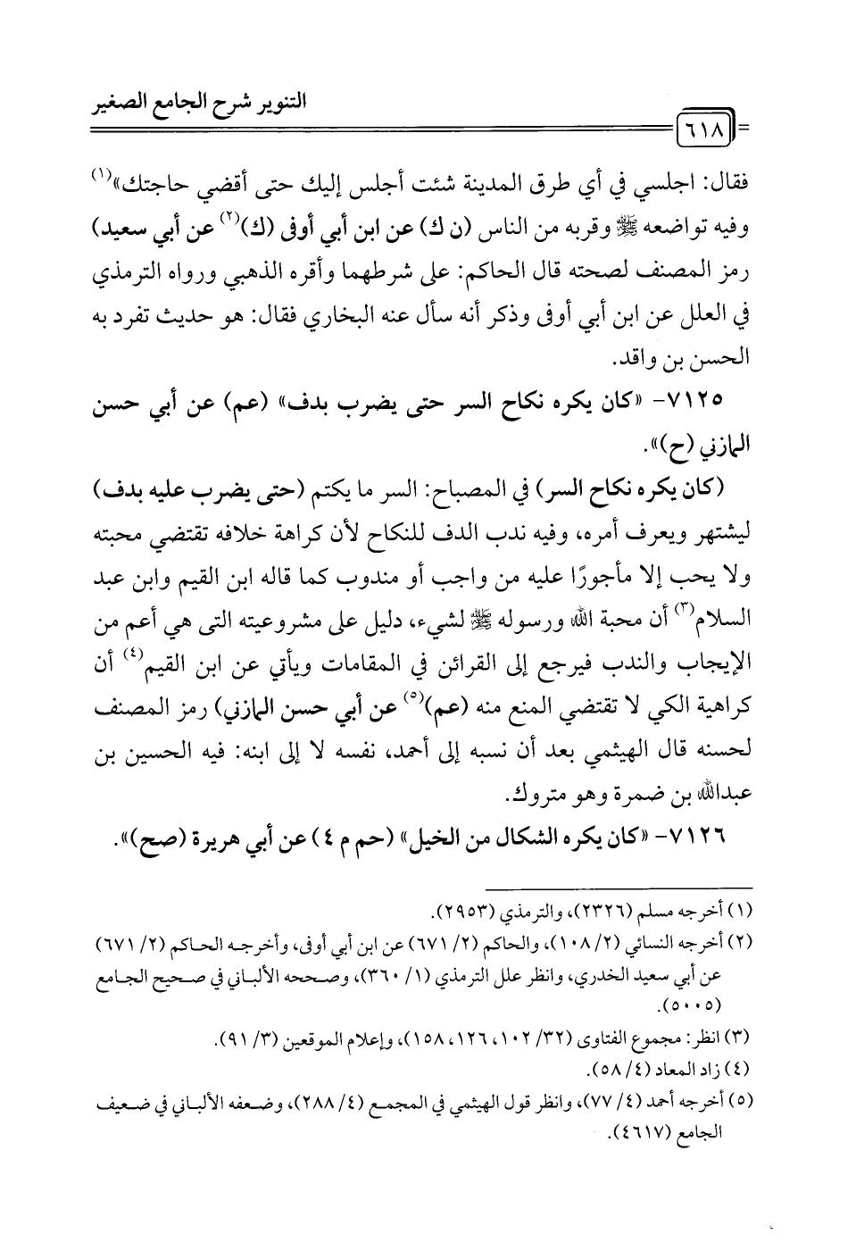 7125 - "كان يكره نكاح السر حتى يضرب بدف" (عم) عن أبي حسن المازني (ح) ".