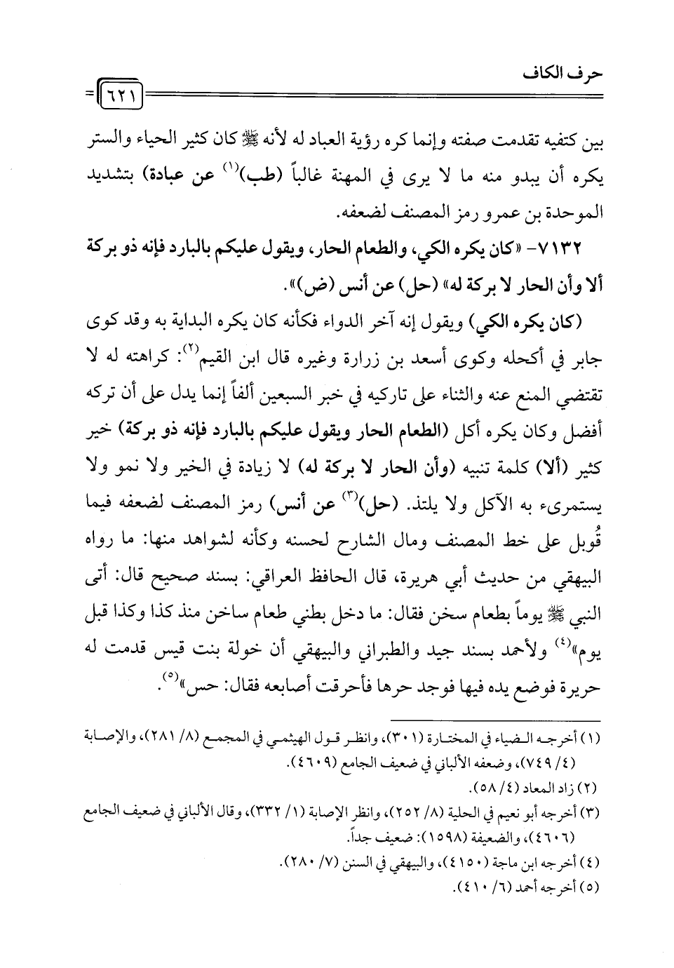 7132 - "كان يكره الكي، والطعام الحار، ويقول عليكم بالبارد فإنه ذو بركة ألا وأن الحار لا بركة له" (حل) عن أنس (ض) ".
