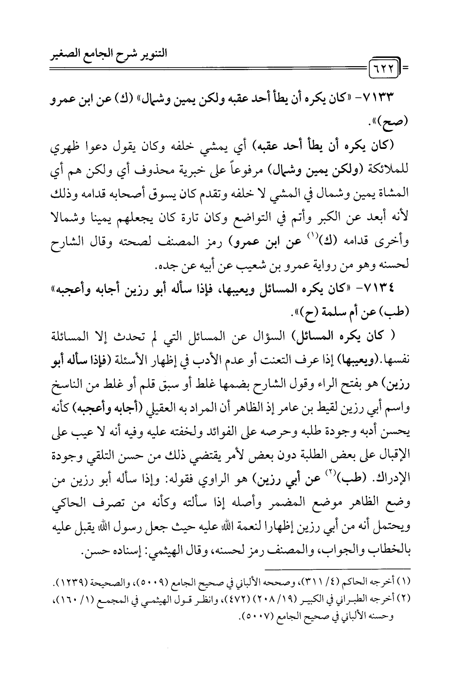 7133 - "كان يكره أن يطأ أحد عقبه ولكن يمين وشمال" (ك) عن ابن عمرو (صح) ".