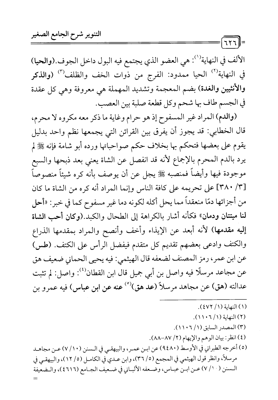 الألف في النهاية (¬1): هي العضو الذي يجتمع فيه البول داخل الجوف. (والحيا) في النهاية (¬2) الحيا ممدود: الفرج من ذوات الخف والظلف (¬3) (والذكر والأنثيين والغدة) بضم المعجمة وتشديد المهملة هي معروفة وهي كل عقدة في الجسم طاف بها شحم وكل قطعة صلبة بين العصب.