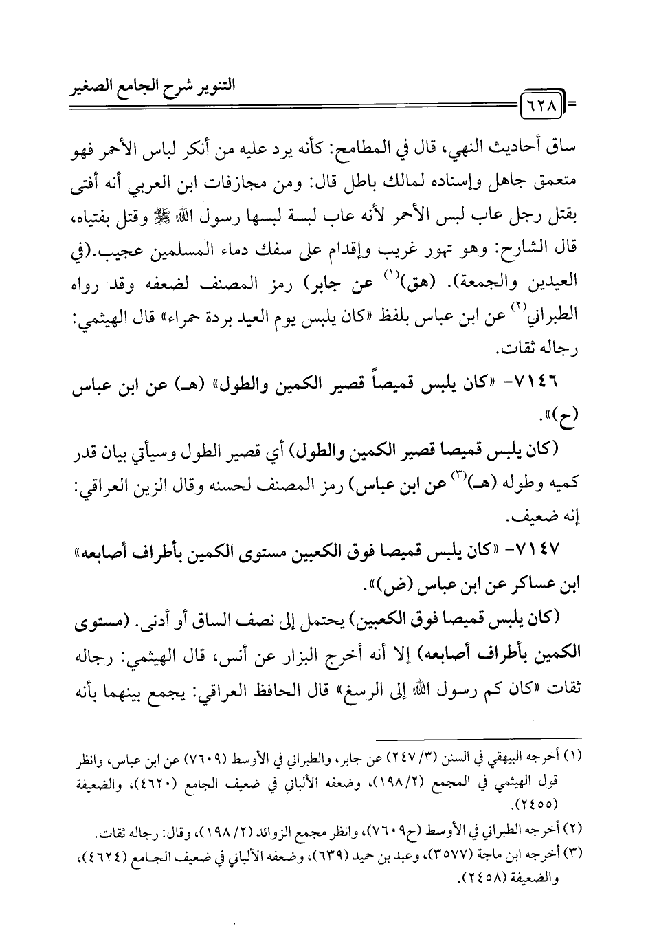 7147 - "كان يلبس قميصا فوق الكعبين مستوى الكمين بأطراف أصابعه" ابن عساكر عن ابن عباس (ض) ".