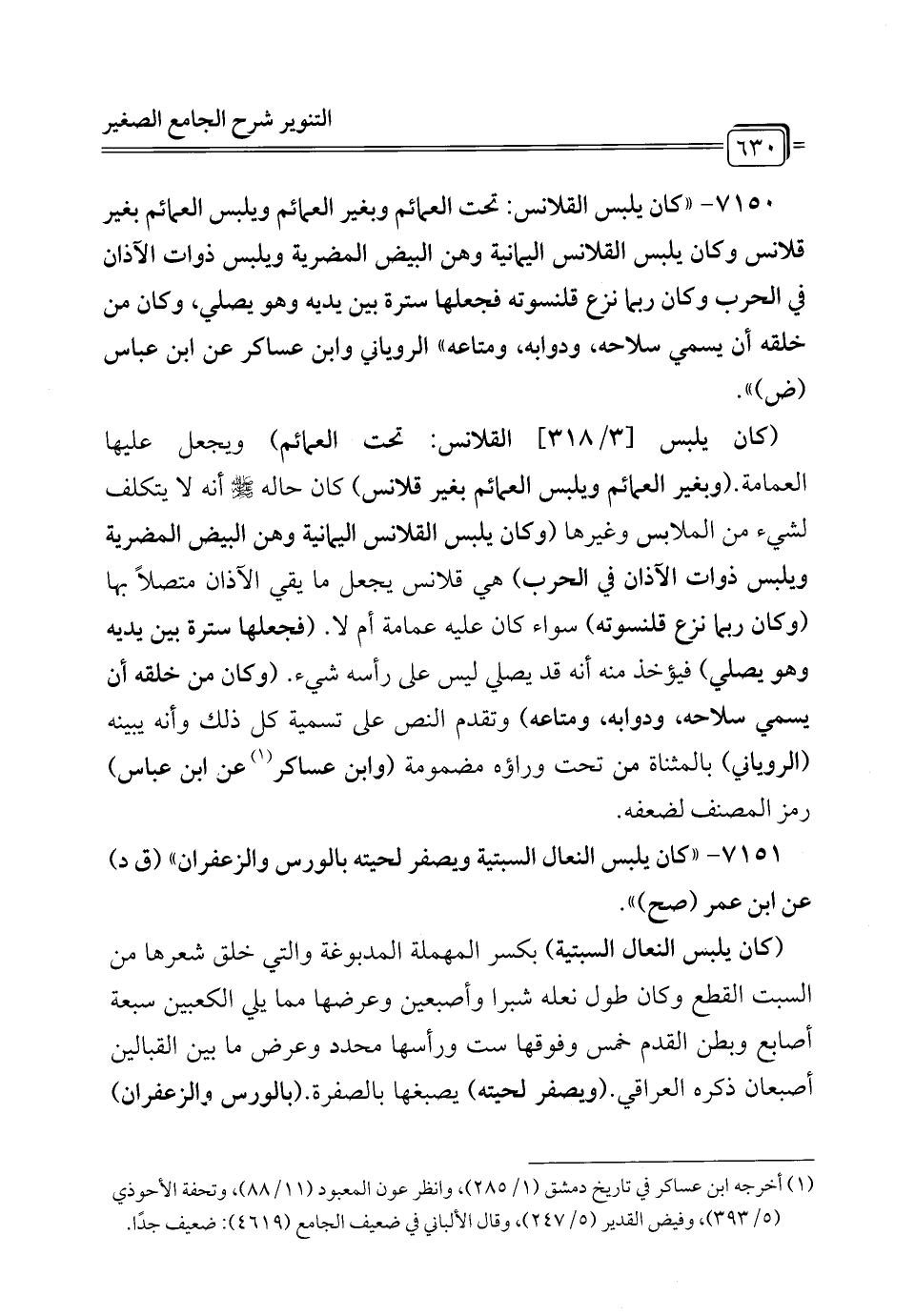 7151 - "كان يلبس النعال السبتية ويصفر لحيته بالورس والزعفران" (ق د) عن ابن عمر (صح) ".