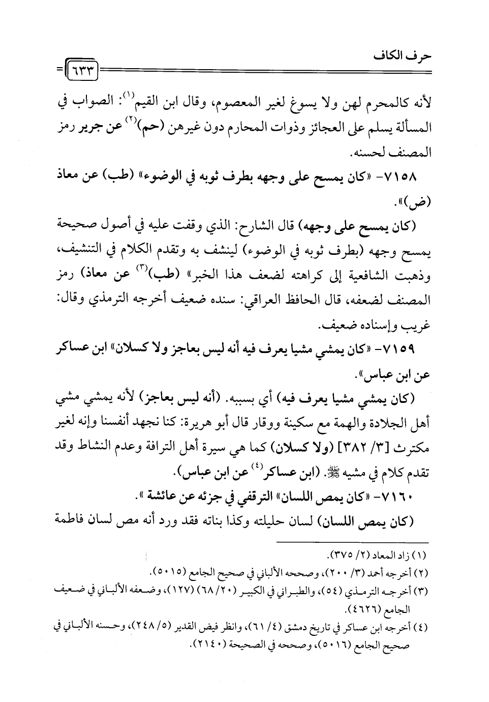 7158 - "كان يمسح على وجهه بطرف ثوبه في الوضوء" (طب) عن معاذ (ض) ".