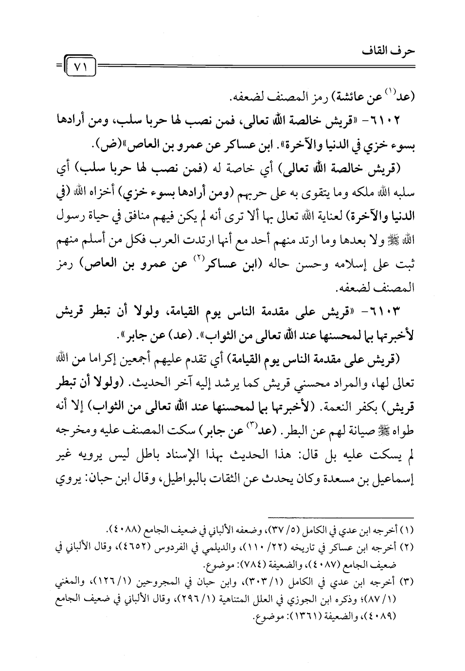 6103 - "قريش على مقدمة الناس يوم القيامة، ولولا أن تبطر قريش لأخبرتها بما لمحسنها عند الله تعالى من الثواب". (عد) عن جابر".