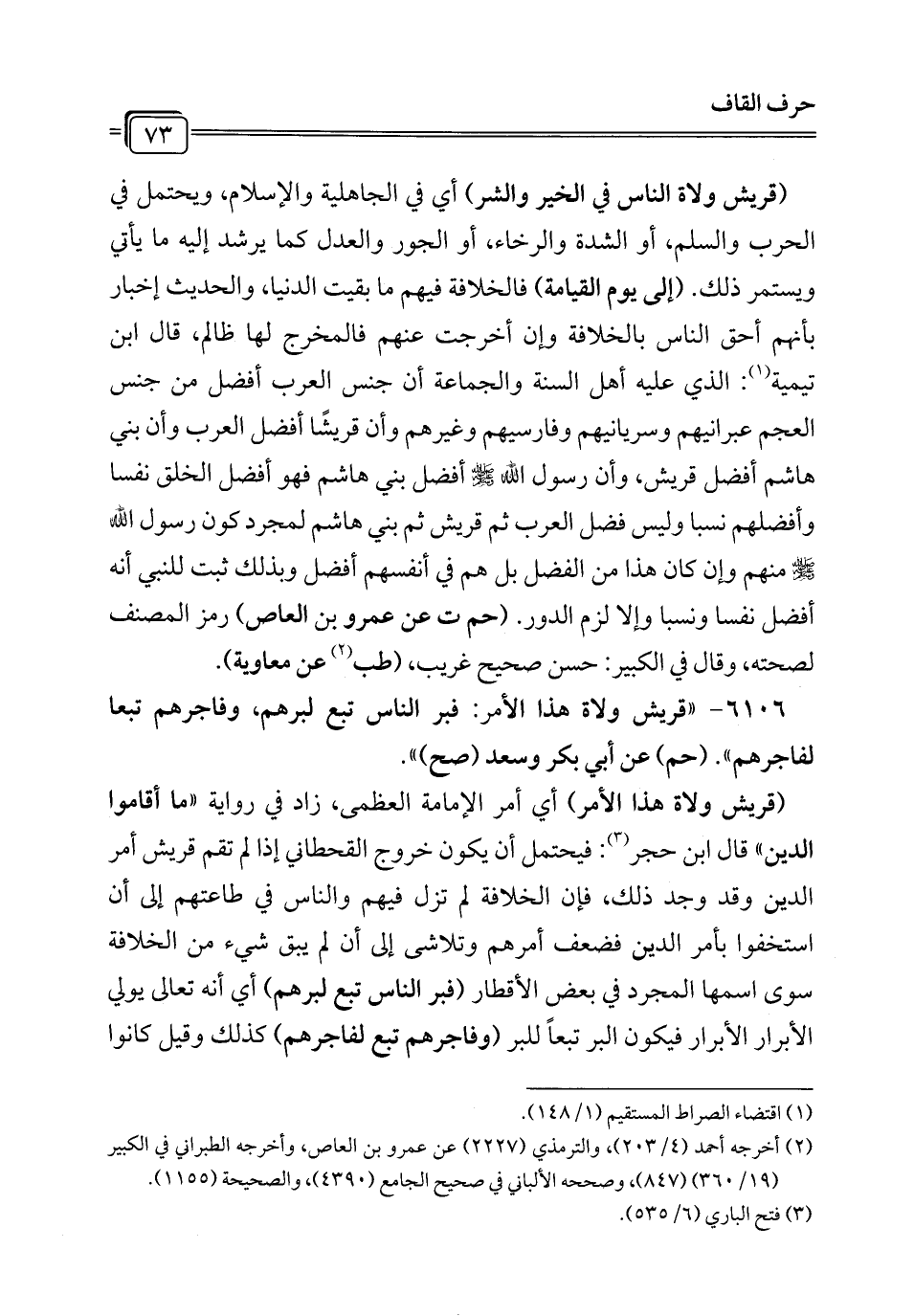 6106 - "قريش ولاة هذا الأمر: فبر الناس تبع لبرهم، وفاجرهم تبعاً لفاجرهم". (حم) عن أبي بكر وسعد (صح) ".