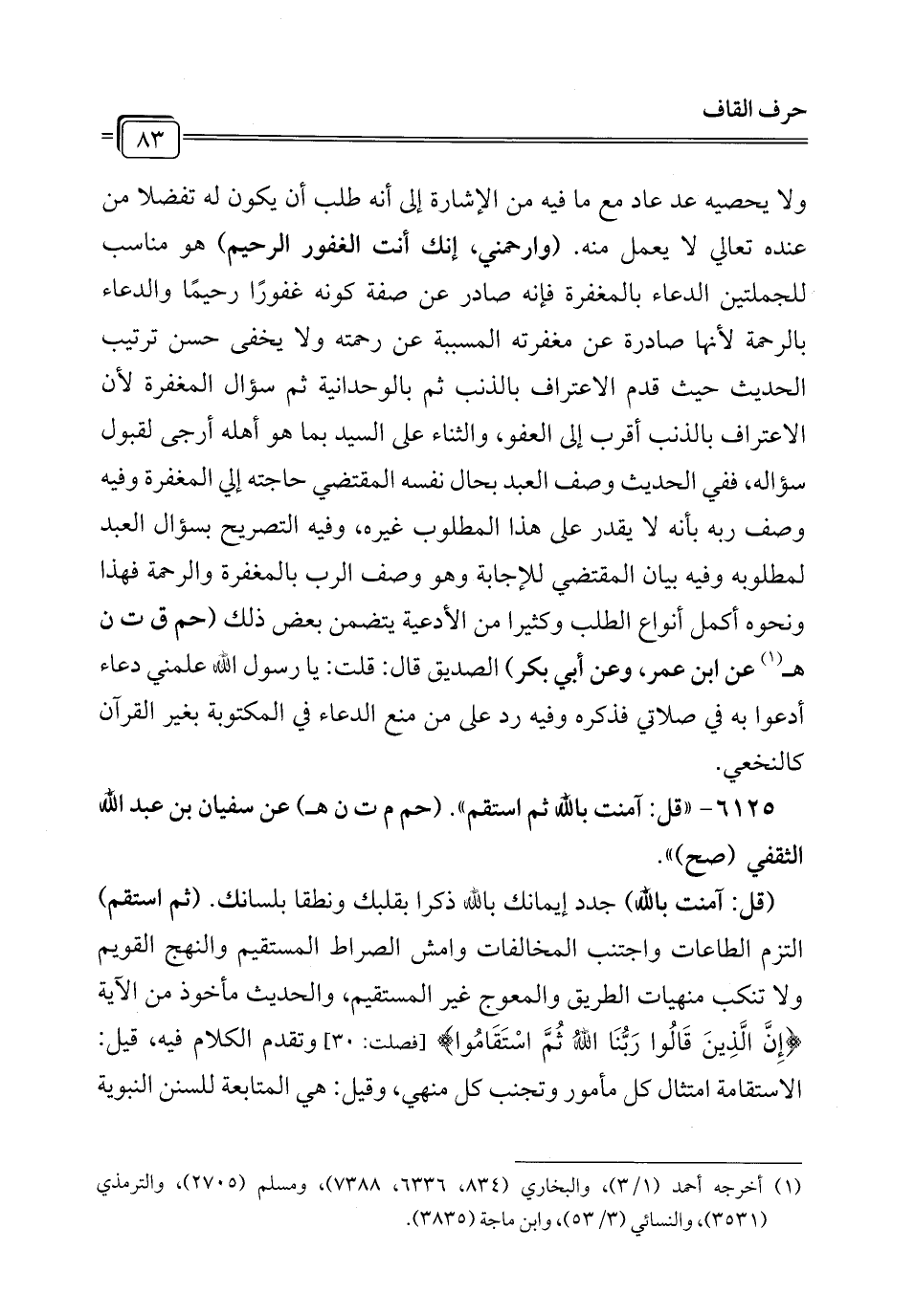 6125 - "قل: آمنت بالله ثم استقم". (حم م ت ن هـ) عن سفيان بن عبد الله الثقفي (صح) ".
