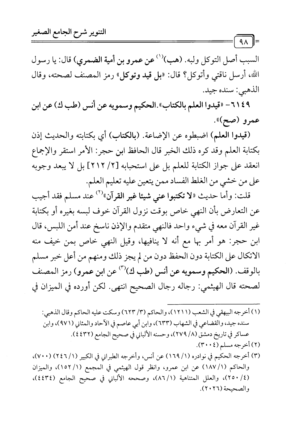 6149 - "قيدوا العلم بالكتاب". الحكيم وسمويه عن أنس (طب ك) عن ابن عمرو (صح) ".