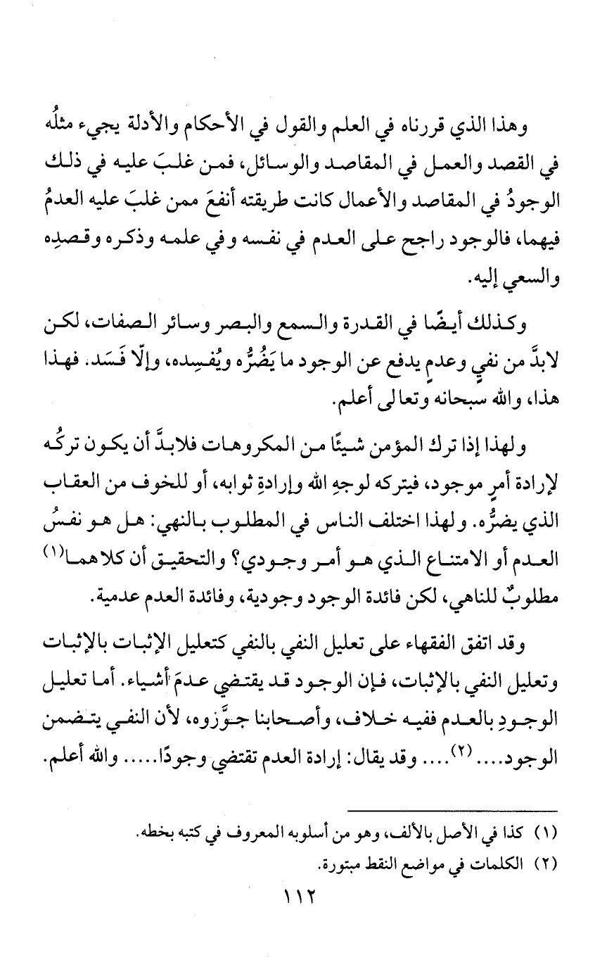 وذلك أن هذا الذي ذكرته في العلم والقول يقوم مثله في الإرادة والعمل؛ فإن الإرادة متوجهة إلى الوجود بنفسه الذي هو الفعل، ومتوجهة إلى العدم الذي هو الترك على طريق التبع، لدفع الفساد عن المقصود الموجود. وإلّا فإرادةُ «لا شيء» لا يستفيد به العبد المريدُ فائدة، ولا تُحصِّل له كمالًا ولا لذةً.