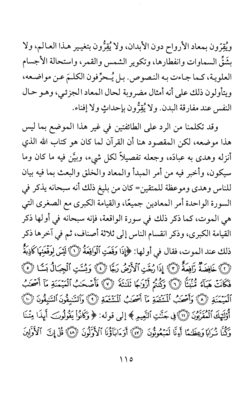 وذلك أن مذهب أهل السنة والجماعة ما دلَّ عليه الكتاب والسنة، واتفق عليه سلفُ الأمة وأئمتُها: الإيمانُ بالقيامة العامة التي يقوم الناس فيها من قبورهم لربّ العالمين، ويَجزِي العبادَ حينئذٍ ويحاسبهم، ويُدخِل فريقًا الجنةَ وفريقًا النارَ، كما هو مبيَّن في الكتاب والسنة.