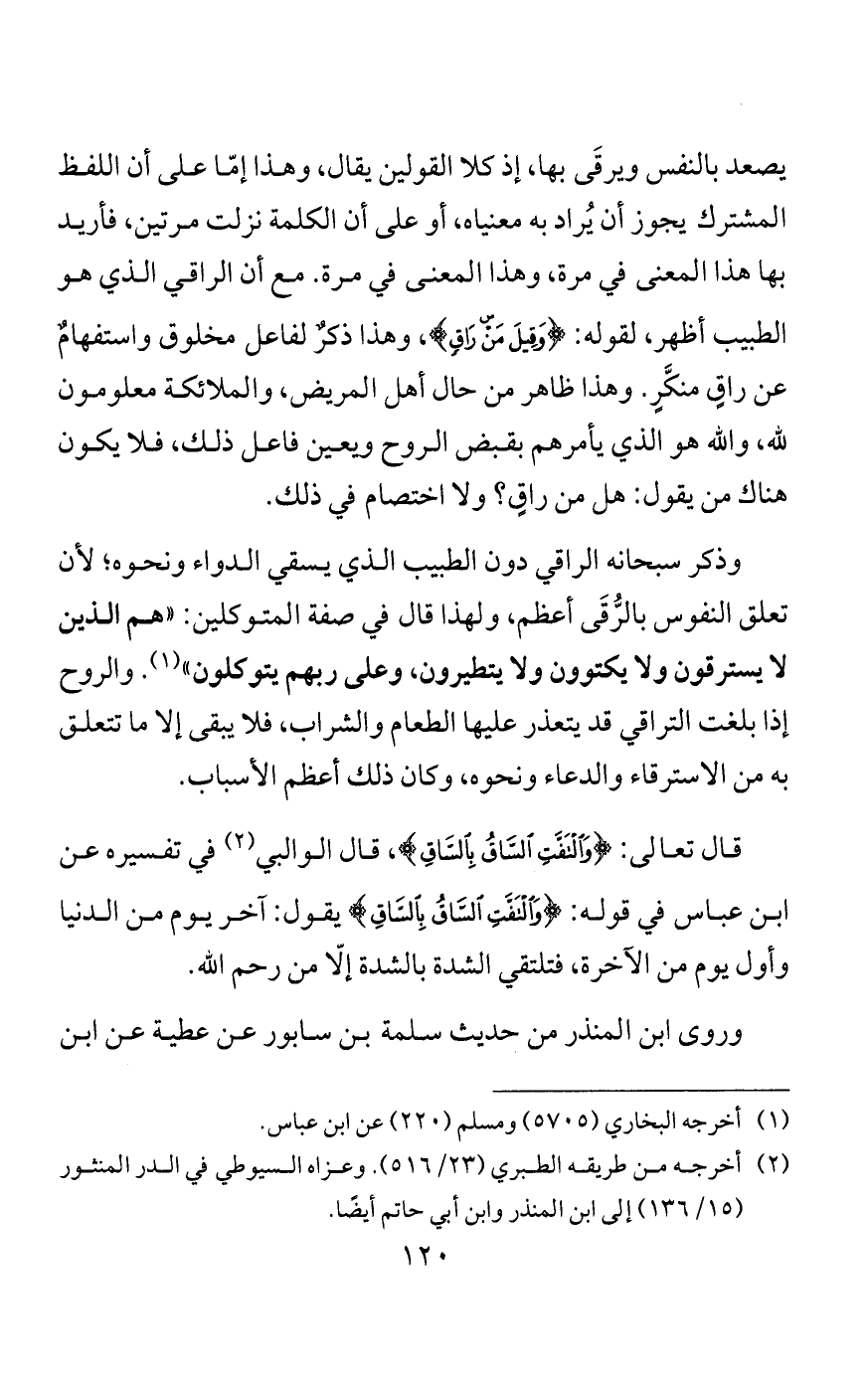 وَظَنَّ أَنَّهُ الْفِرَاقُ (28) وَالْتَفَّتِ السَّاقُ بِالسَّاقِ (29) إِلَى رَبِّكَ يَوْمَئِذٍ الْمَسَاقُ} [القيامة:26 - 30]. وهذا ذِكرٌ لحال الموت. روى أبو بكر ابن المنذر في تفسيره وغيره من حديث هشام الدستوائي عن عمرو بن مالك عن أبي الجوزاء عن ابن عباس: حتى إذا بلغت التراقي، قال: تُنْتَزعُ نفسُه حتى إذا كانت في تراقيه قالوا: من يَصعد بنفسه؟ ملائكة الرحمة أو ملائكة العذاب؟ فذلك قوله: {وَقِيلَ مَنْ رَاقٍ}.