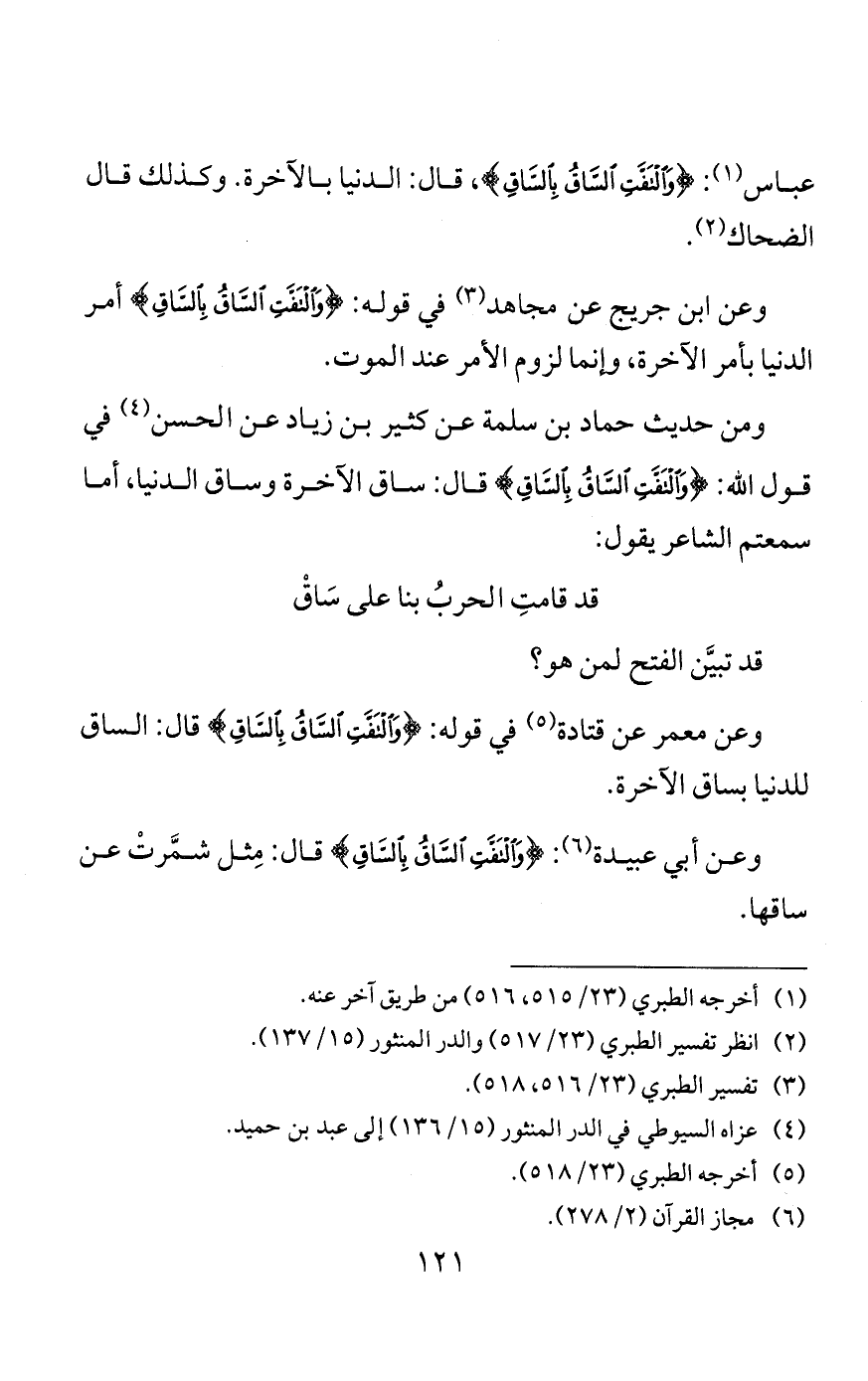 وعلى القولين فالضمير في «بلغت» للنفس، قال ابن ثور عن ابن جريج في قوله: {كَلَّا إِذَا بَلَغَتِ التَّرَاقِيَ} قال: الحلقوم.