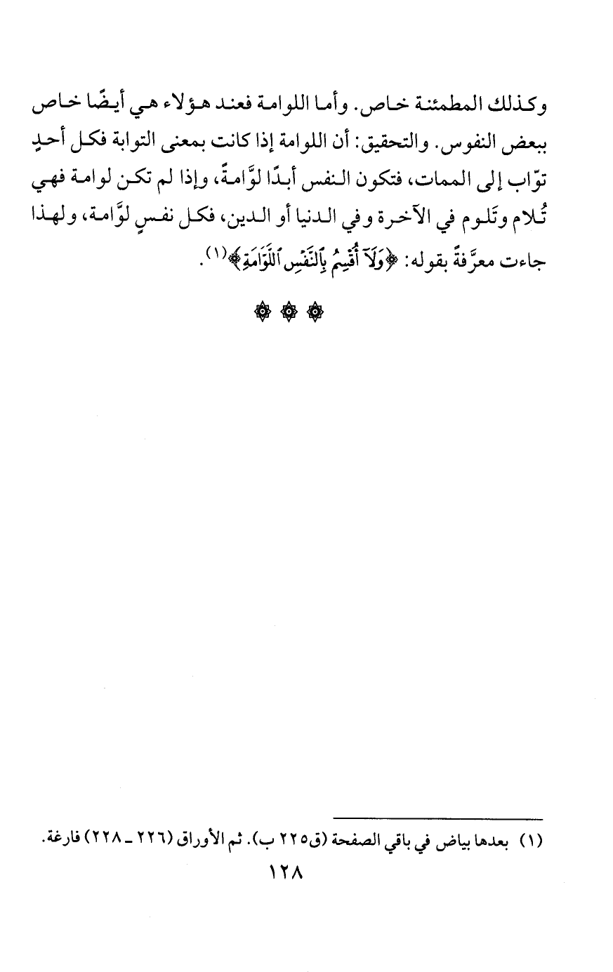 قلت: وعلى هذا فاللوَّامة نحو الندَّامة والتوَّابة، والله يحب التوابين ويحب المتطهرين، وهذا لا ينافي القول الأول، فإنها مذمومة قبل الندم بذمها وندمها، ملومة على ذلك، وهي ممدوحة بعد توبتها ولومها لنفسها. وفي مسند الإمام أحمد عن علي عن النبي صلى الله عليه وسلم قال: «إن الله يحب العبد المفتَّن التواب».