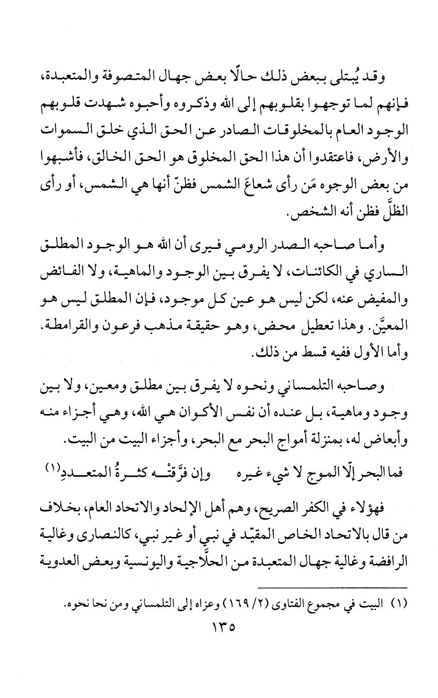 وأما النوع الثاني فالكلام المتضمن للكفر والنفاق، لا سيما إذا زُخرِف بالعبارات والشُّبهات، وحُسِّن باللحون والأصوات، من نظمٍ ونثرٍ، مثل كلام القرامطة والإسماعيلية، وكلام التلمساني نظمه ونثره، وكلام ابن سبعين والبلياني وغيرهم من الملاحدة؛ فإن حروفهم سبب لاعتقاد الضلال، وهو اعتقاد أن الله هو المخلوقات، وأنه ليس وراء المخلوق خالقٌ خَلَقَه متميزٌ عنه، كحقيقة قولِ فرعون والقرامطة من جحود خالقِ الخلقِ؛ لكن فرعون نفاه بقوله ظاهرًا وباطنًا، فهو أكفر من هذا الوجه، ومن جهة أنه كان معاندًا جاحدًا. وهؤلاء قد يكون أحدهم ضالًّا يعتقد أنه على هدًى. ففرعون أكفر منهم من جهة أنه نفاه مطلقًا، وأنه كان معاندًا في نفيه وجحوده مستكبرًا عليه.