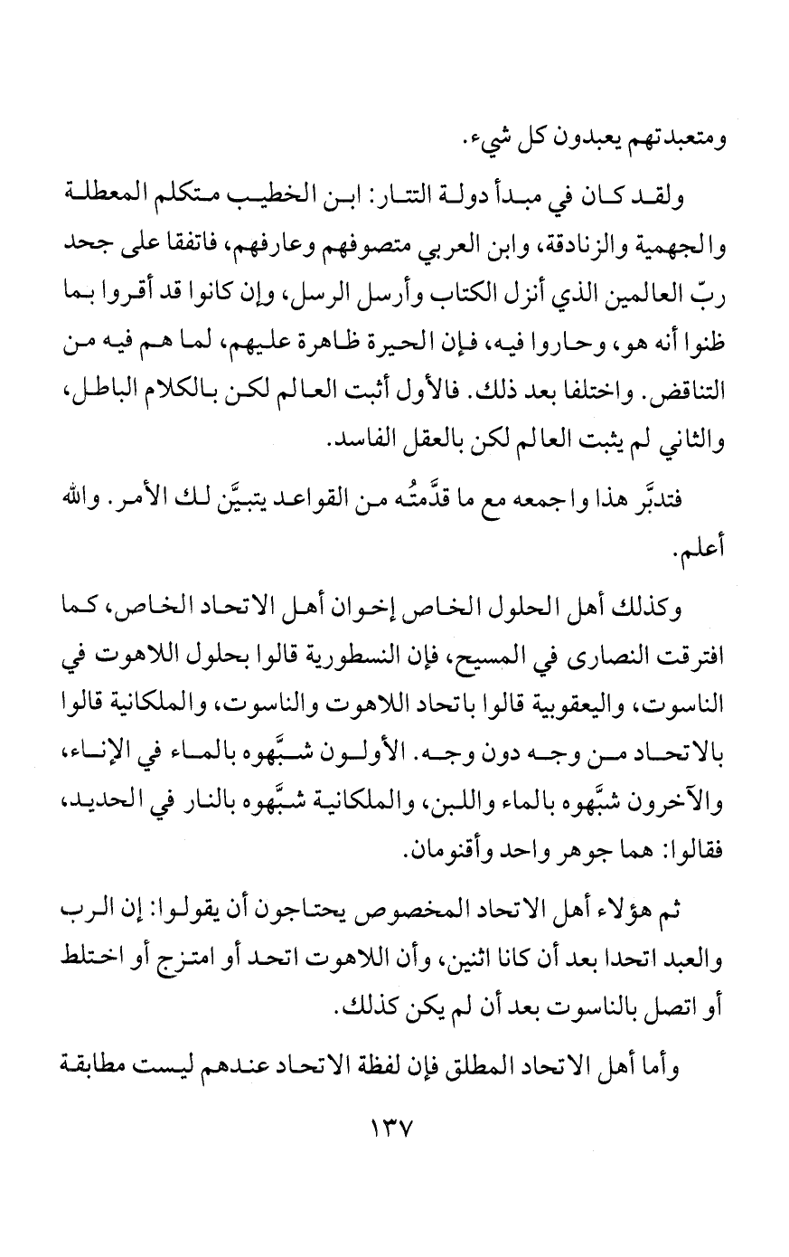 فهؤلاء في الكفر الصريح، وهم أهل الإلحاد والاتحاد العام، بخلاف من قال بالاتحاد الخاص المقيّد في نبي أو غير نبي، كالنصارى وغالية الرافضة وغالية جهال المتعبدة من الحلَّاجية واليونسية وبعض العدوية