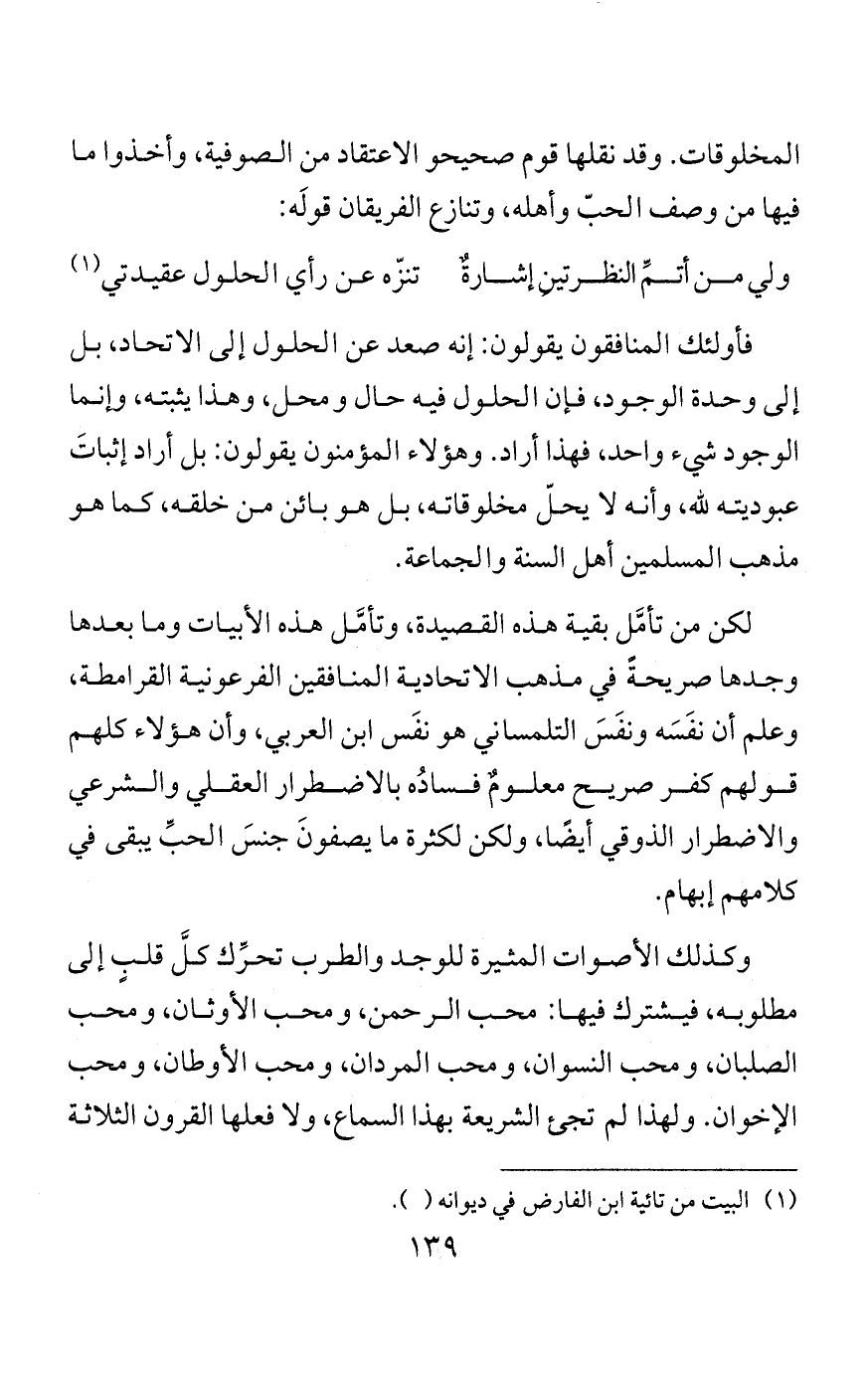 ولقد كان في مبدأ دولة التتار: ابن الخطيب متكلم المعطلة والجهمية والزنادقة، وابن العربي متصوفهم وعارفهم، فاتفقا على جحد ربّ العالمين الذي أنزل الكتاب وأرسل الرسل، وإن كانوا قد أقروا بما ظنوا أنه هو، وحاروا فيه، فإن الحيرة ظاهرة عليهم، لما هم فيه من التناقض. واختلفا بعد ذلك. فالأول أثبت العالم لكن بالكلام الباطل، والثاني لم يثبت العالم لكن بالعقل الفاسد.