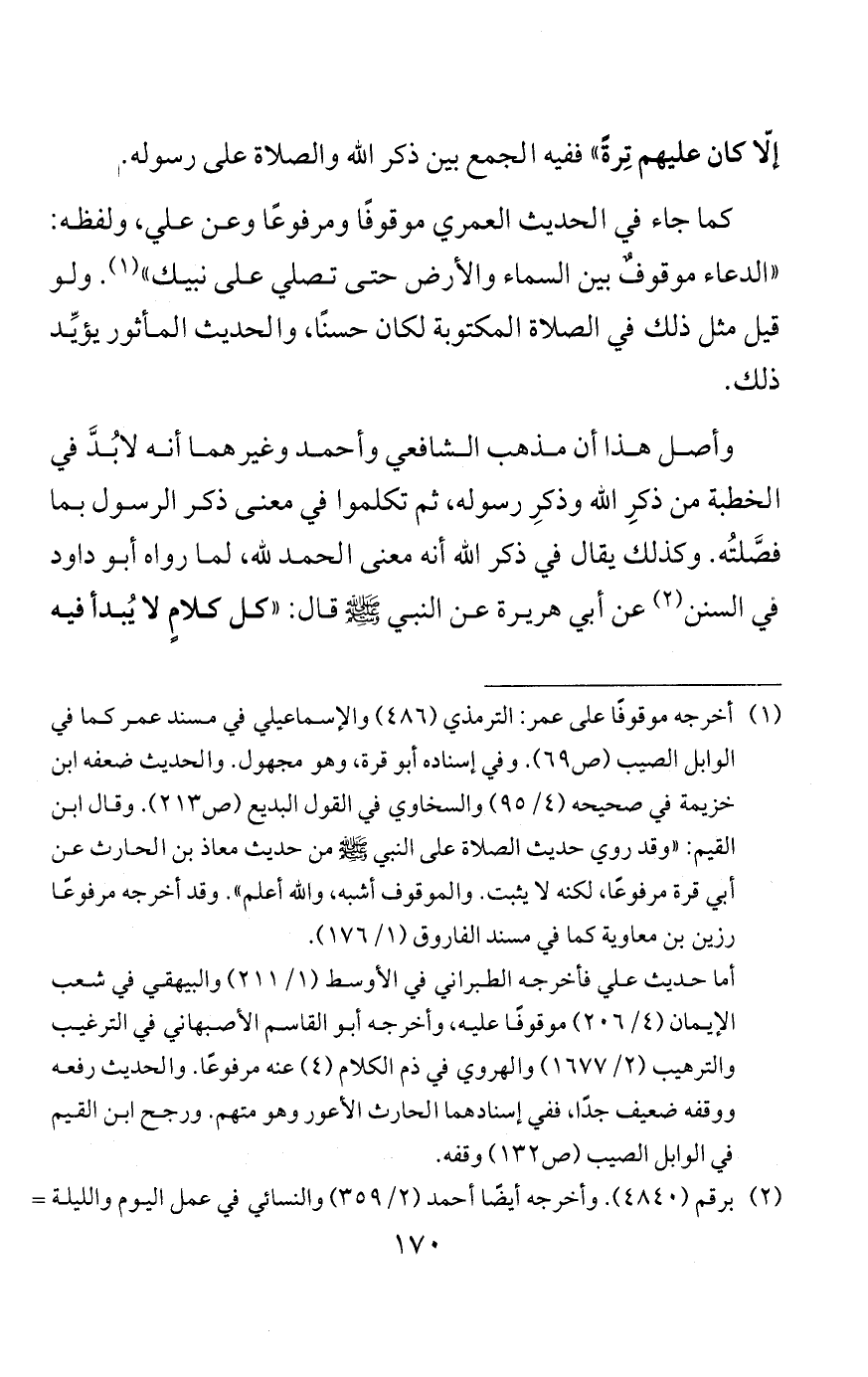ثم هل تَجبُ الصلاةُ عليه في الخطبة كما تجب في الصلاة عند من يقول بذلك؟ هذا محلُّ اجتهاد، فيحتمل أن يقال به قياسًا على الصلاة، ويحتمل أن لا يقال به قياسًا على الأذان. مع أن الخطب المنقولة عنه لم تشتمل إلّا على الشهادتين، وكذلك الخطبة التي علَّمها لأصحابه خطبة ابن مسعود، وكذلك قوله: «كلُّ خطبةٍ ليس فيها تشهُّدٌ فهي كاليد الجذماء».