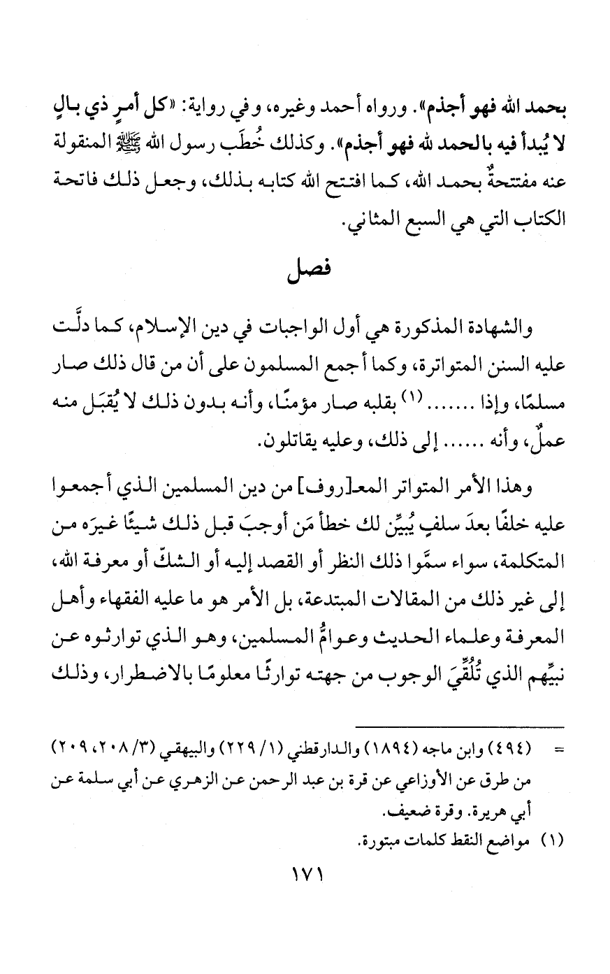 ...... ففي هذه الرسائل ذكر الحمد لله والصلاة على رسول الله ...... وشهادة [أن لا إله إلا الله وأن] محمدًا عبده ورسوله، .... للشهادة بالرسالة، ويوافقه الحديث المرفوع في السنن: «ما اجتمع قومٌ مجلسًا ثمَّ تفرَّقوا عنه، ولم يذكروا الله فيه، ولم يُصلُّوا على نبيِّهم،