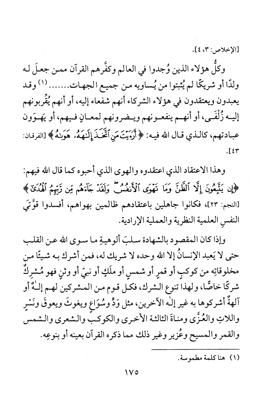 والإله هو المعبود الصمد المقصود الذي إليه المنتهى، والشركُ الذي حرَّمه الله على ألسُنِ رُسلِه، وحكمَ بكُفْرِ أصحابه عبادةُ إلهٍ سواه، وإن كان العابد له يعتقد ذلك خلقًا من مخلوقاته، فإن هذا قول جميع المشركين من جميع الأمم، لم يكن من المشركين من يقول: إنّ مع الله إلهًا مساويًا له في صفاتِه أو أفعاله، أو أنه شاركه في خلق جميع المخلوقات، بل جمهور من أشرك به يُقِرُّ بأن شريكَه مملوكُه، سواء أشركوا به الملائكة أو الكواكبَ أو الأنبياء أو الصالحين أو الجنّ أو