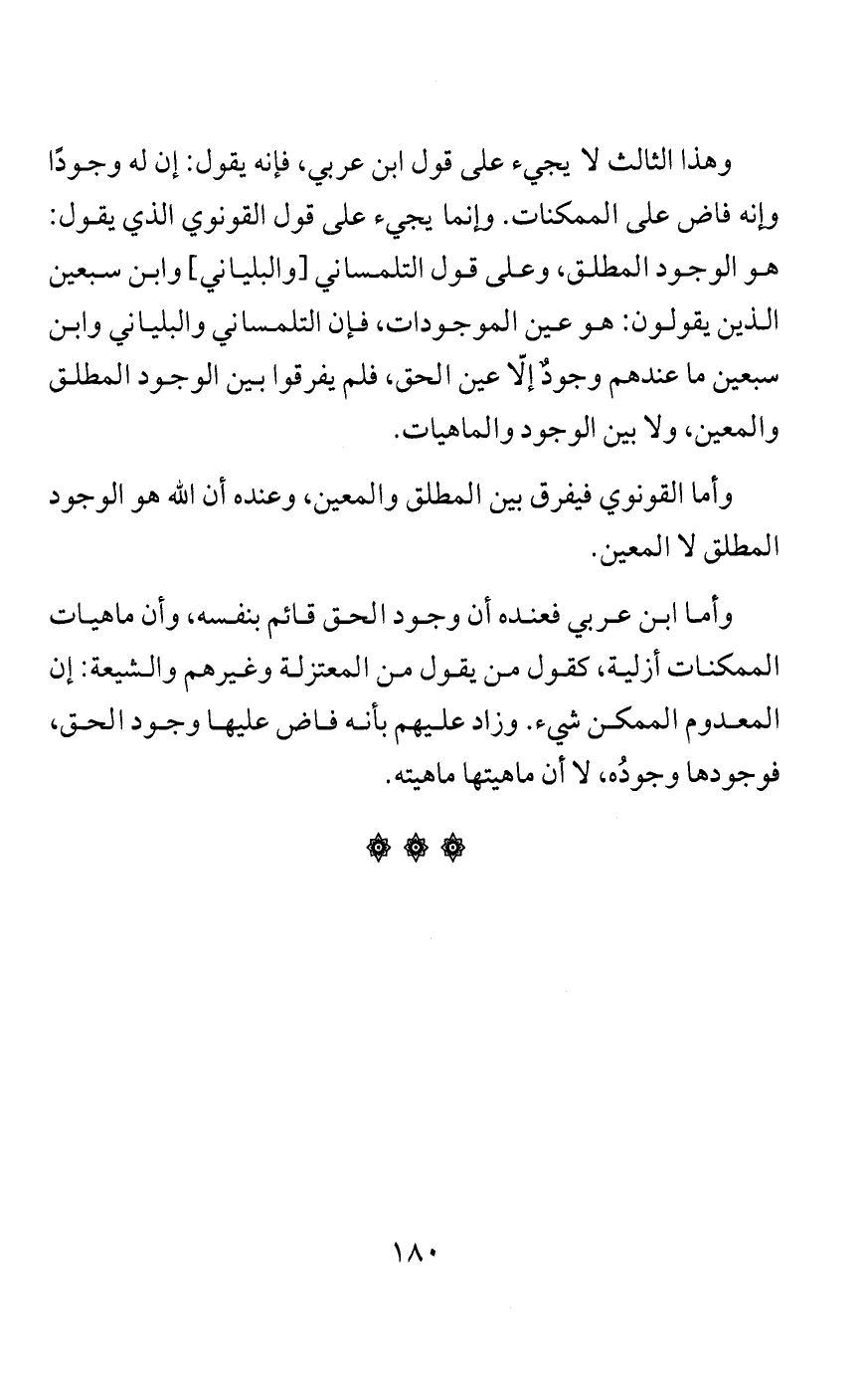 وهذا قول القونوي والتلمساني وابن سبعين وغيرهم ممن لا يجعل له وجودًا متميزًا عن وجود مخلوقاته، بخلاف قول ابن العربي الذي يجعل له وجودًا متميزًا، ويقول: إن ذلك الوجود فاض على الممكنات. فهذا القول أمثل، ولهذا هو عند الاتحادية أبعد عن التحقيق. هذا إذا اقتصروا على عبادة الوجود المطلق، وأما إن عبدوا الوجود كلَّه المطلق والمعيَّن كما هو قول التلمساني والبلياني وابن سبعين فقد أشركوا به جميعَ الكائنات المطلق والمعين. وهذا القول الثالث أخسُّ أقوالهم، وهو عند غالبهم عين التحقيق.