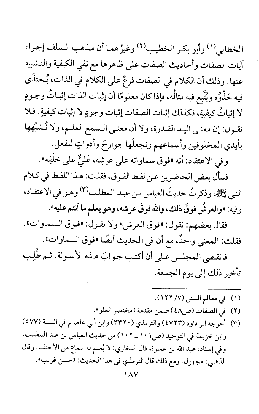 وقُرئ ما ذُكِر في العقيدة في مسألة القرآن من «أن القرآن كلام الله منزَّلٌ غير مخلوقٍ، منه بدأ وإليه يعود»، كما اتفق عليه السلف، وذكرت لفظًا أن الجمع في قولهم: القرآن هو الحرف والصوت أو ليس بحرفٍ ولا صوتٍ كلاهما بدعةٌ حدثت بعد المئة الثالثة، لم يتكلم الإمام أحمد ولا غيرُه من الأئمة بهذا التركيب نفيًا ولا إثباتًا. وذكرتُ أن لي جوابًا من سنين عن هذه المسألة ....... وأحضرتُه في المجلس الثاني: أن الله تكلم بالقرآن حقيقةً، وهذا لا خلافَ فيه بين المسلمين، وأن هذا القرآن الذي يقرؤه المسلمون هو كلام الله حقيقةً؛ لأن الكلام إنما يُضاف حقيقةً إلى من قاله مبتدئًا لا إلى من قاله مبلِّغًا مؤدِّيًا. وذكر بعض الحاضرين أن هذا أول شبهةٍ كانت عندهم، وأن هذا تخليصٌ لهذا الموضع.