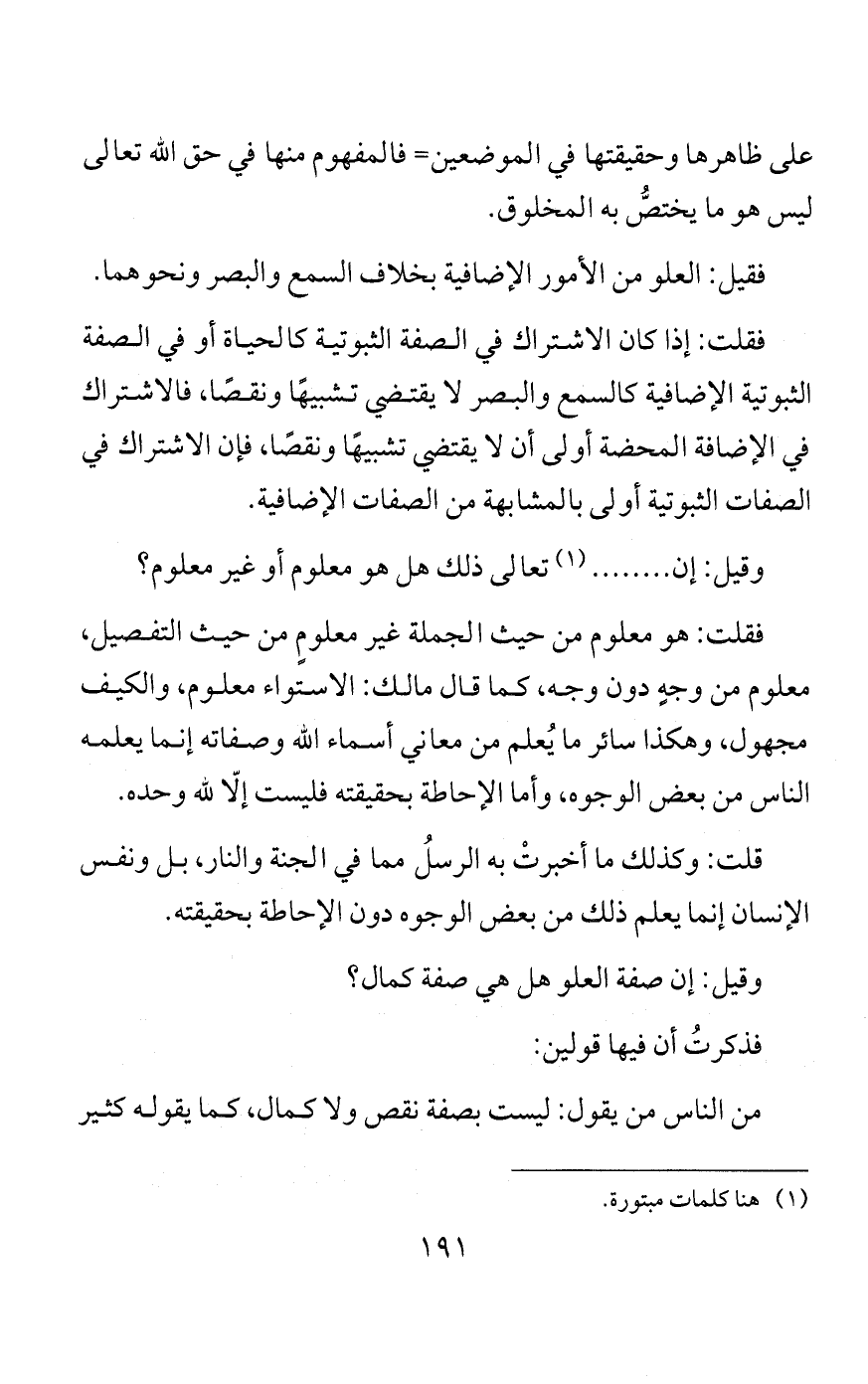 وكلهم يقول: «مع نفي الكيفية والتشبيه عنها»، ويقولون: إذا كانت ذات الله ثابتةً حقيقةً وأسماؤه على ظاهرها مع أنا لا نعلم كيفية ذاتِه وصفاتِه، فكذلك صفاته، إذ العلم بكيفية الصفة فرعٌ على العلم بكيفية الموصوف، فإذا قال السائل: كيف صفاتُه؟ فقُلْ: كيف هو في ذاته؟ فإذا قال: لا أعلَمُ كيفيةَ ذاتِه، فقُلْ: لا أعلَمُ كيفيةَ صفاتِه.