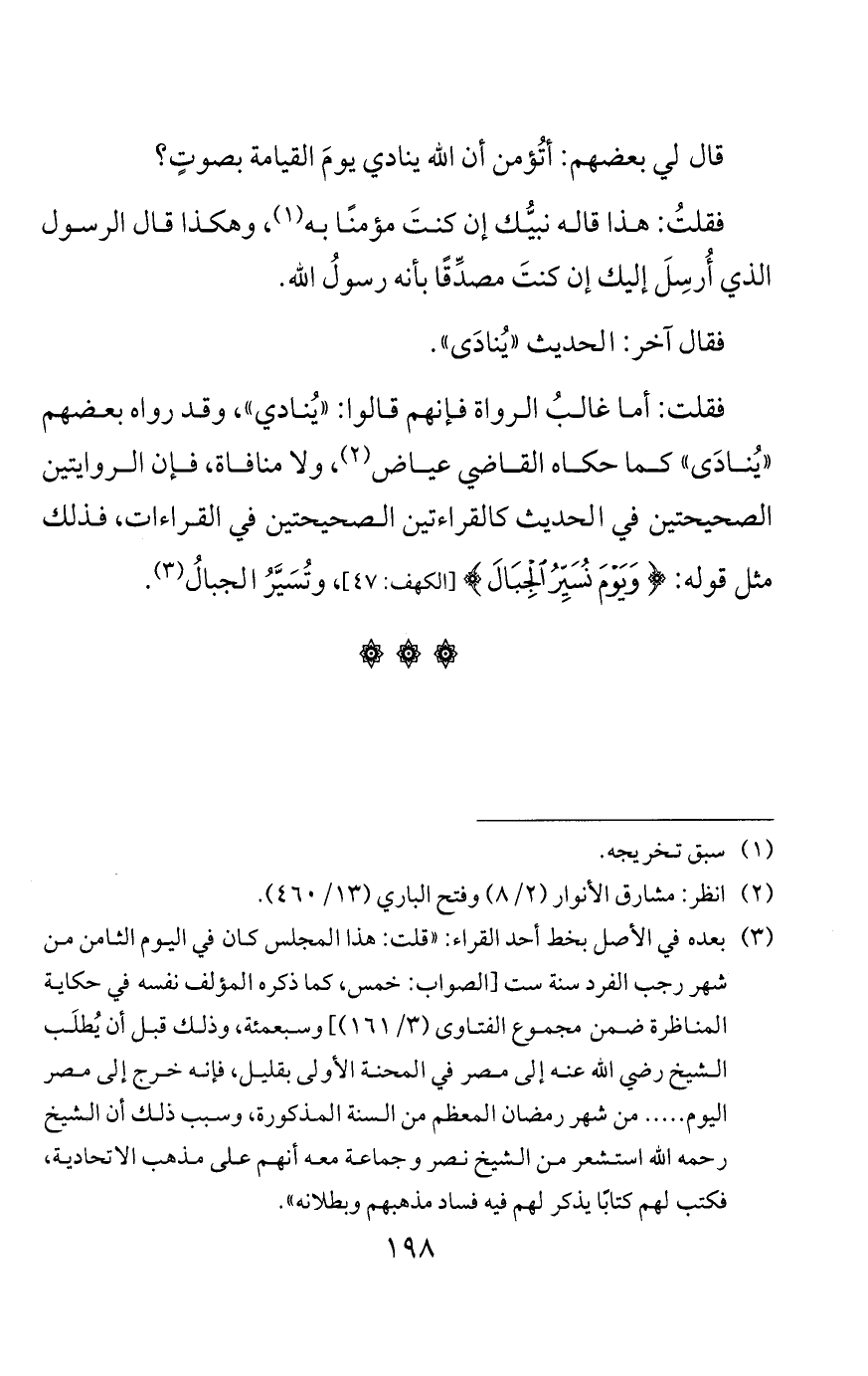 فقلت: الكتاب والسنة لا يكون بدعة، إنما البدعة مثل اعتقاد ابن التومرت ونحوه، والسلف إنما كرهوا الكلام المخالف للكتاب والسنة، كما قال الشافعي رضي الله عنه: حكمي في أهل الكلام أن يُضرَبوا بالجريد ويُطافَ بهم في القبائل والعشائر، ويقالَ هذا جزاءُ من تركَ الكتابَ والسنةَ وأقبلَ على الكلام. فإنما عابوا على من ترك الكتاب والسنة.