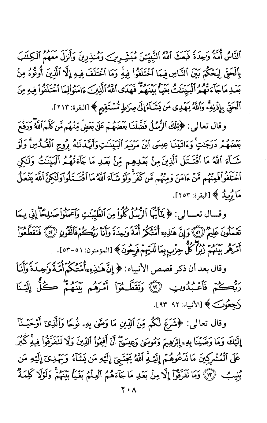 وهذا الأصل وإن كانت سورة البقرة تضمَّنته فكذلك كثير من السور بل أكثرها، مثل سورة آل عمران التي قال في أولها: {الم (1) اللَّهُ لَا إِلَهَ إِلَّا هُوَ الْحَيُّ الْقَيُّومُ (2) نَزَّلَ عَلَيْكَ الْكِتَابَ بِالْحَقِّ مُصَدِّقًا لِمَا بَيْنَ يَدَيْهِ وَأَنْزَلَ التَّوْرَاةَ وَالْإِنْجِيلَ (3) مِنْ قَبْلُ هُدًى لِلنَّاسِ وَأَنْزَلَ الْفُرْقَانَ، إِنَّ الَّذِينَ كَفَرُوا بِآيَاتِ اللَّهِ لَهُمْ عَذَابٌ شَدِيدٌ} [آل عمران:1 - 4]. وذكر في أثنائها ما ذكر من الإيمان بالله ورسله، ثم ختمها بمثل ذلك في قوله: {وَإِنَّ مِنْ أَهْلِ الْكِتَابِ لَمَنْ يُؤْمِنُ بِاللَّهِ وَمَا أُنْزِلَ إِلَيْكُمْ وَمَا أُنْزِلَ إِلَيْهِمْ خَاشِعِينَ لِلَّهِ لَا يَشْتَرُونَ بِآيَاتِ اللَّهِ ثَمَنًا قَلِيلًا، أُولَئِكَ لَهُمْ أَجْرُهُمْ عِنْدَ رَبِّهِمْ، إِنَّ اللَّهَ سَرِيعُ الْحِسَابِ} [آل عمران:199].